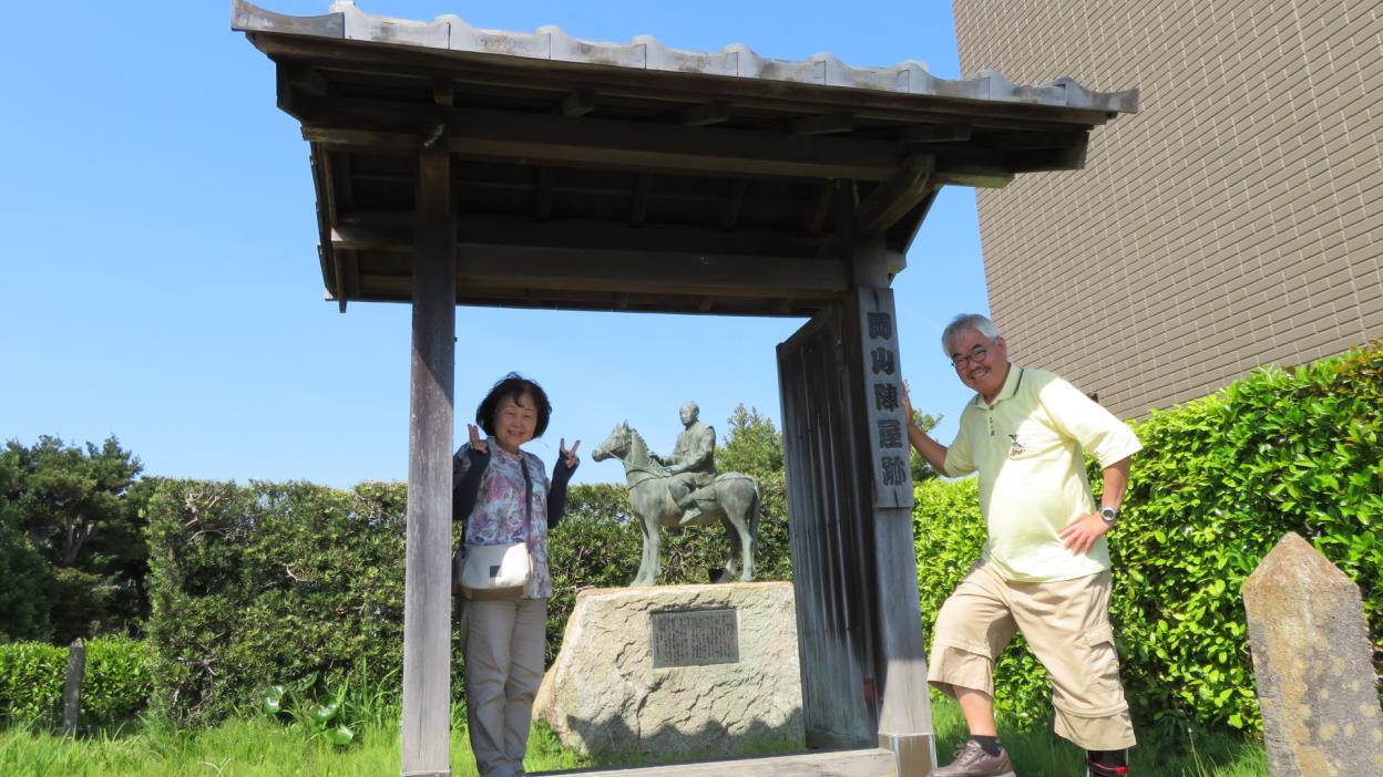 陣屋跡に、小さな門と馬に乗った吉良の殿様の像がある