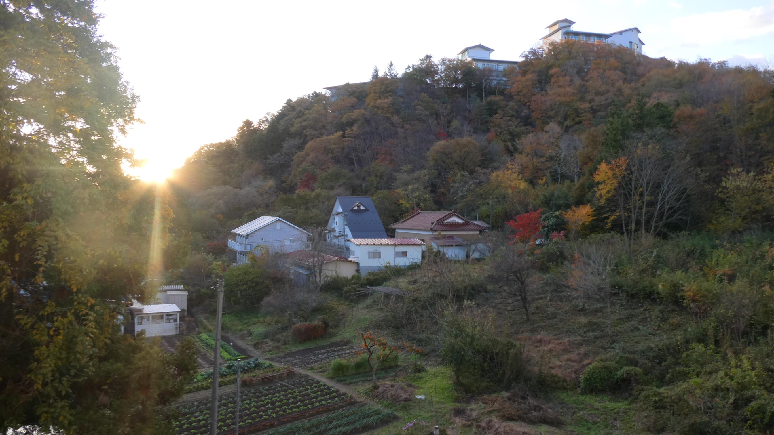 部屋からの眺め 隣の山は紅葉していて山頂にホテルがある ちょうど日の出で、朝から良い景色が見えた
