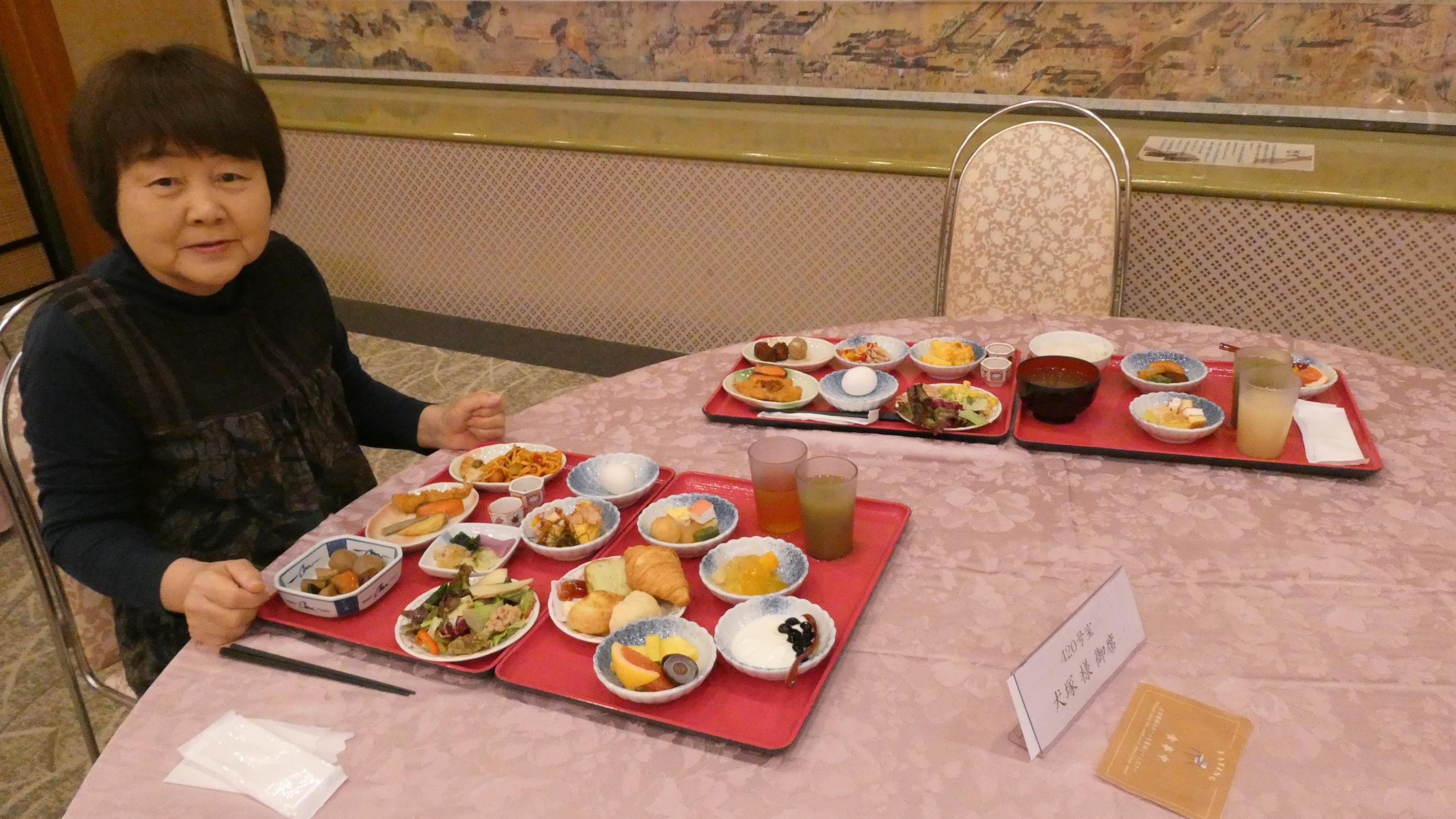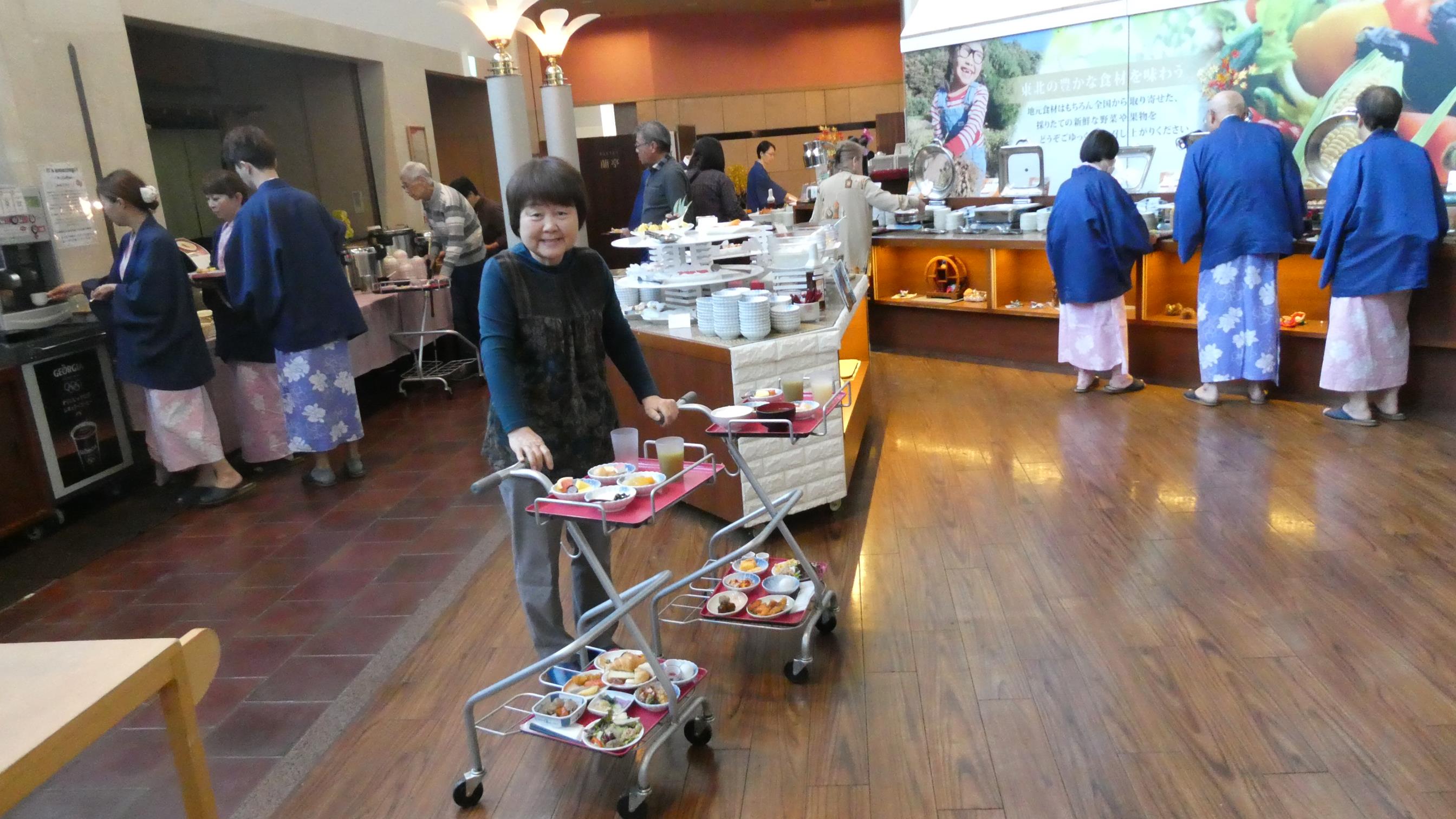 朝食は定食が良いが、バイキングだった 食材は別の部屋にあり、隣の食堂へ運ばなければならない