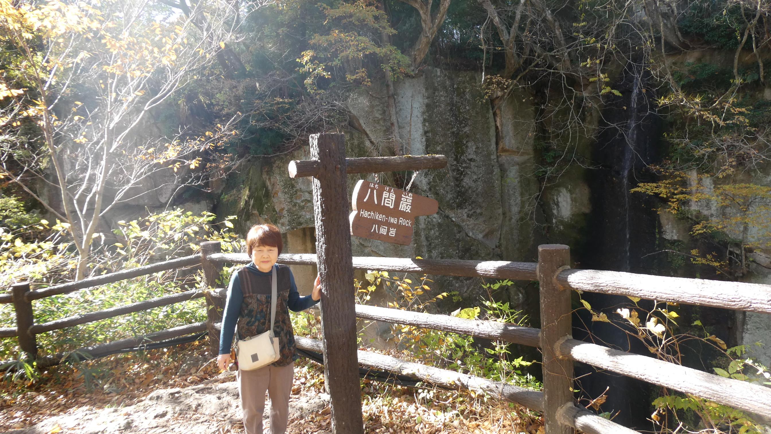 八間巌は、向かいの垂直に立つ大きな岩と思われる