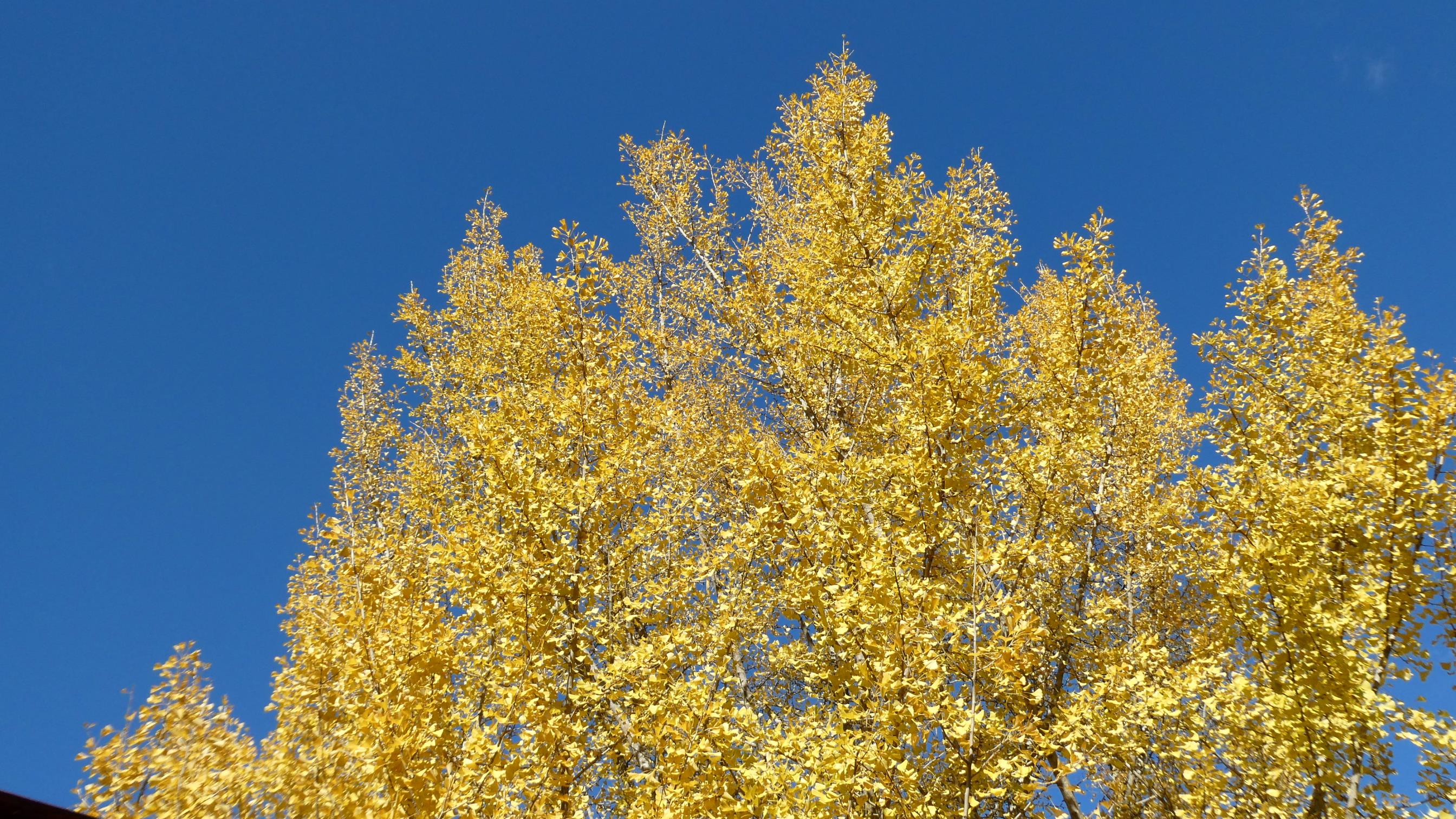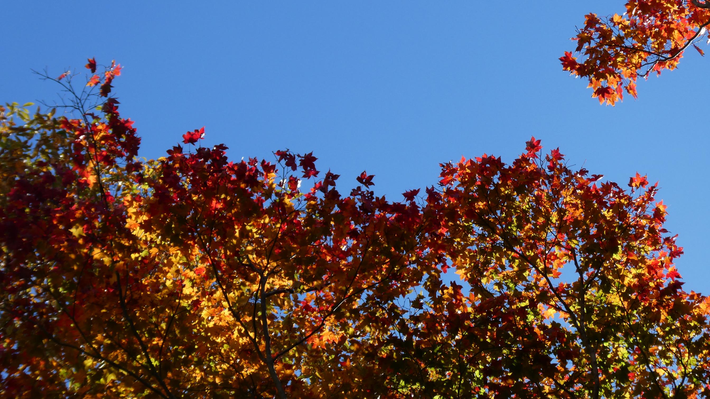 モミジが朝の澄んだ青空に映えて、とてもキレイ
