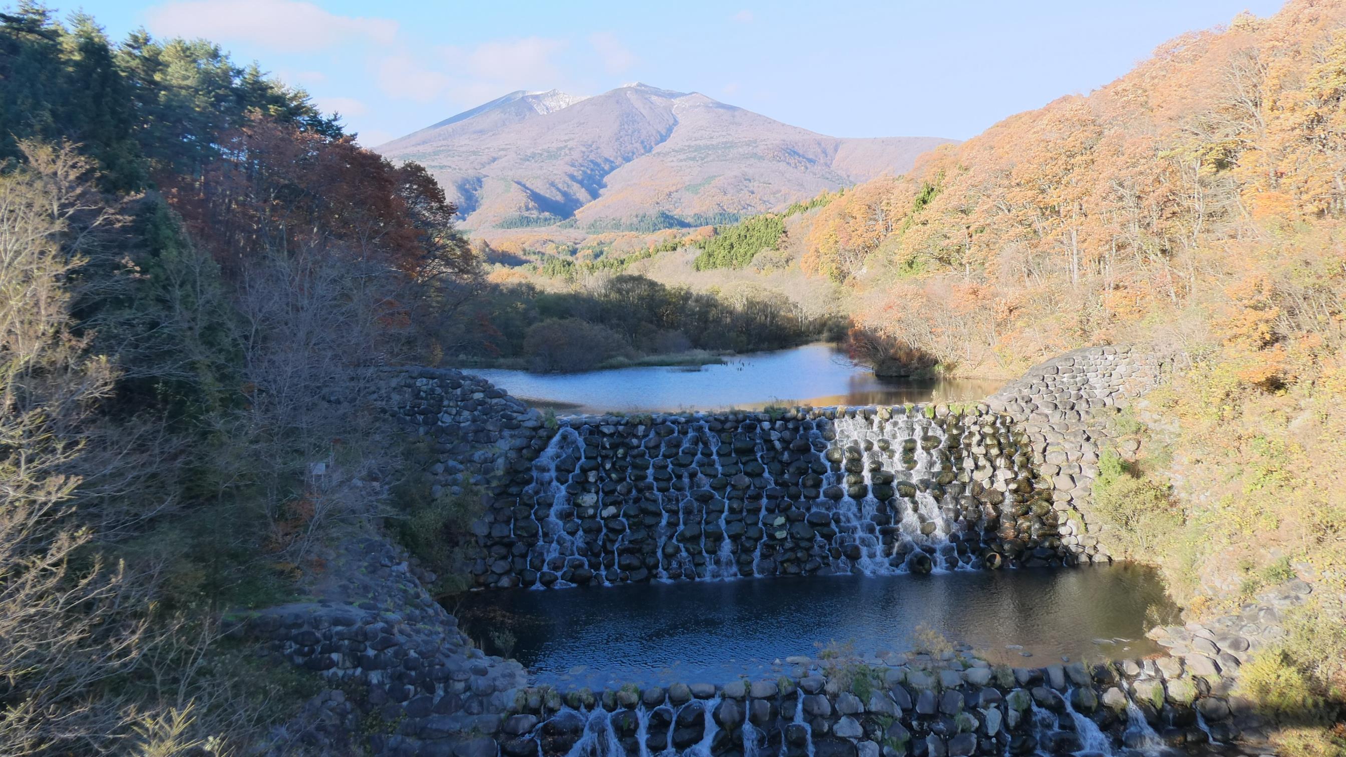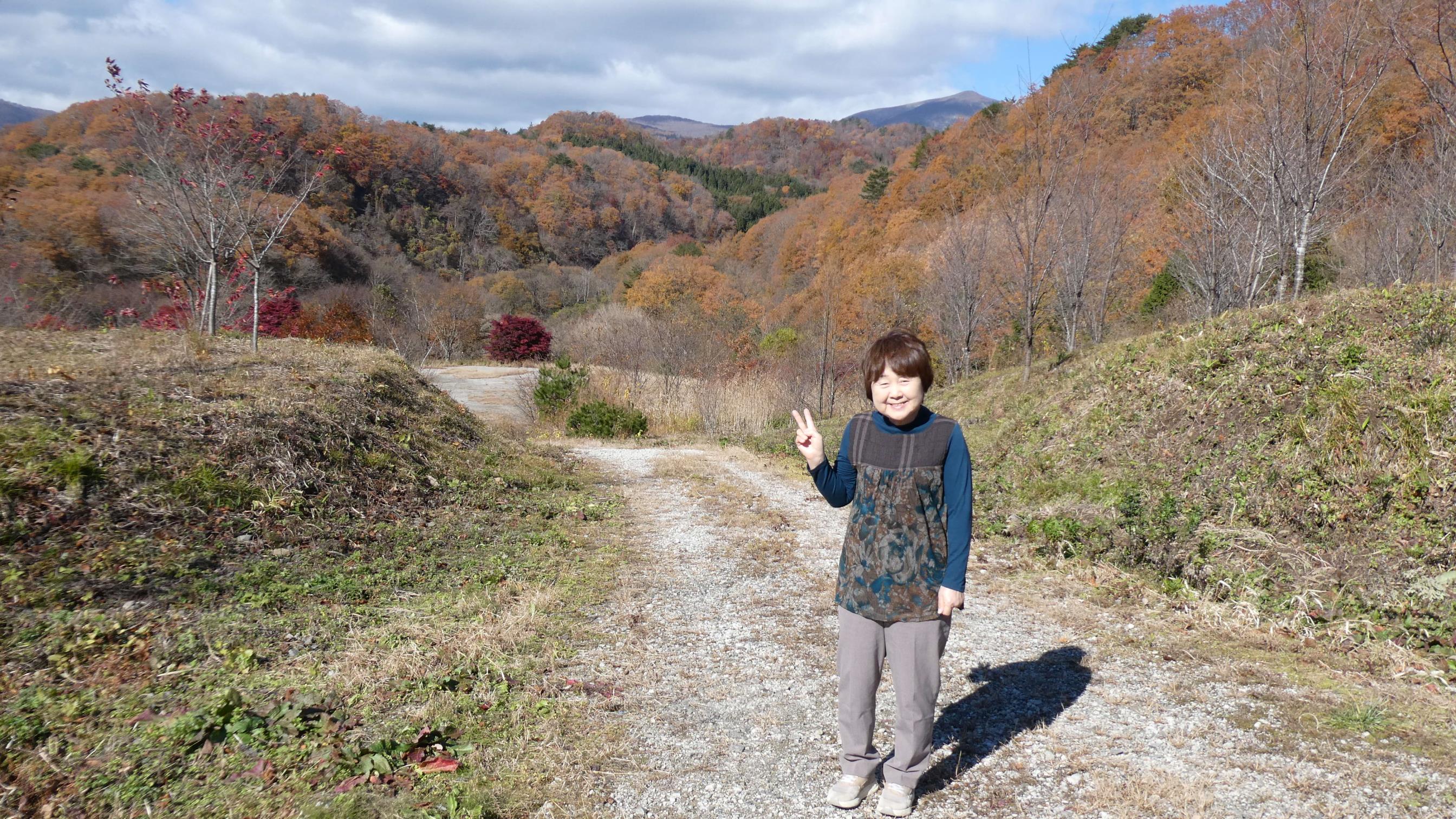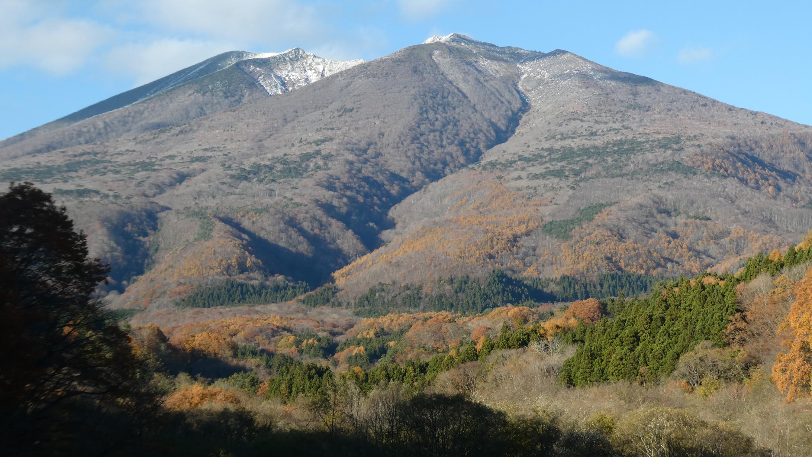 途中、紅葉の山の奥にカッコ良い山が見えた 蔵王かもと思い、立止まって写真撮る ※方向的に蔵王ではない