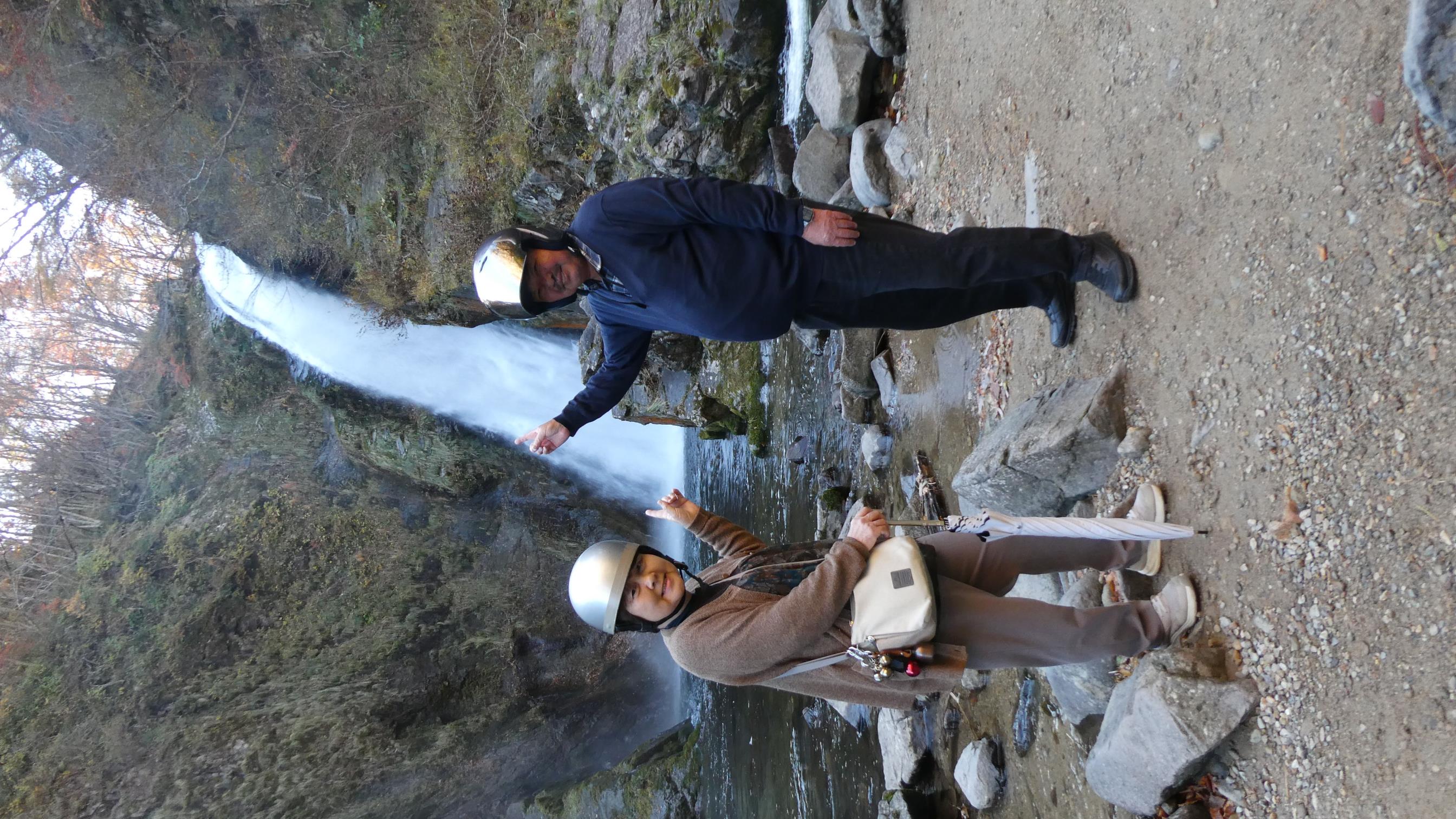 滝壺への道は険しい所もあったが、無事に着く 熊対策スタイルで記念撮影