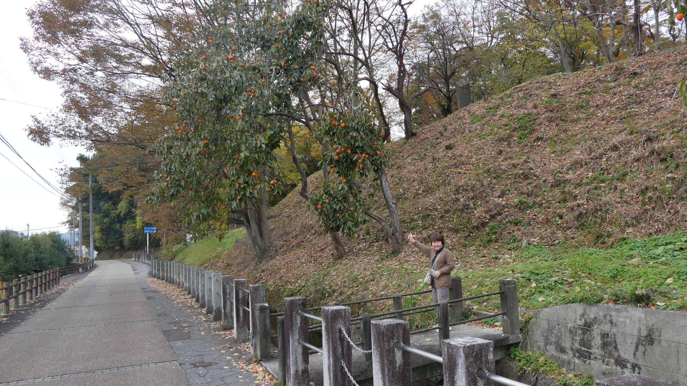 土塁の柿木は実がいっぱい 熊の出没が心配される