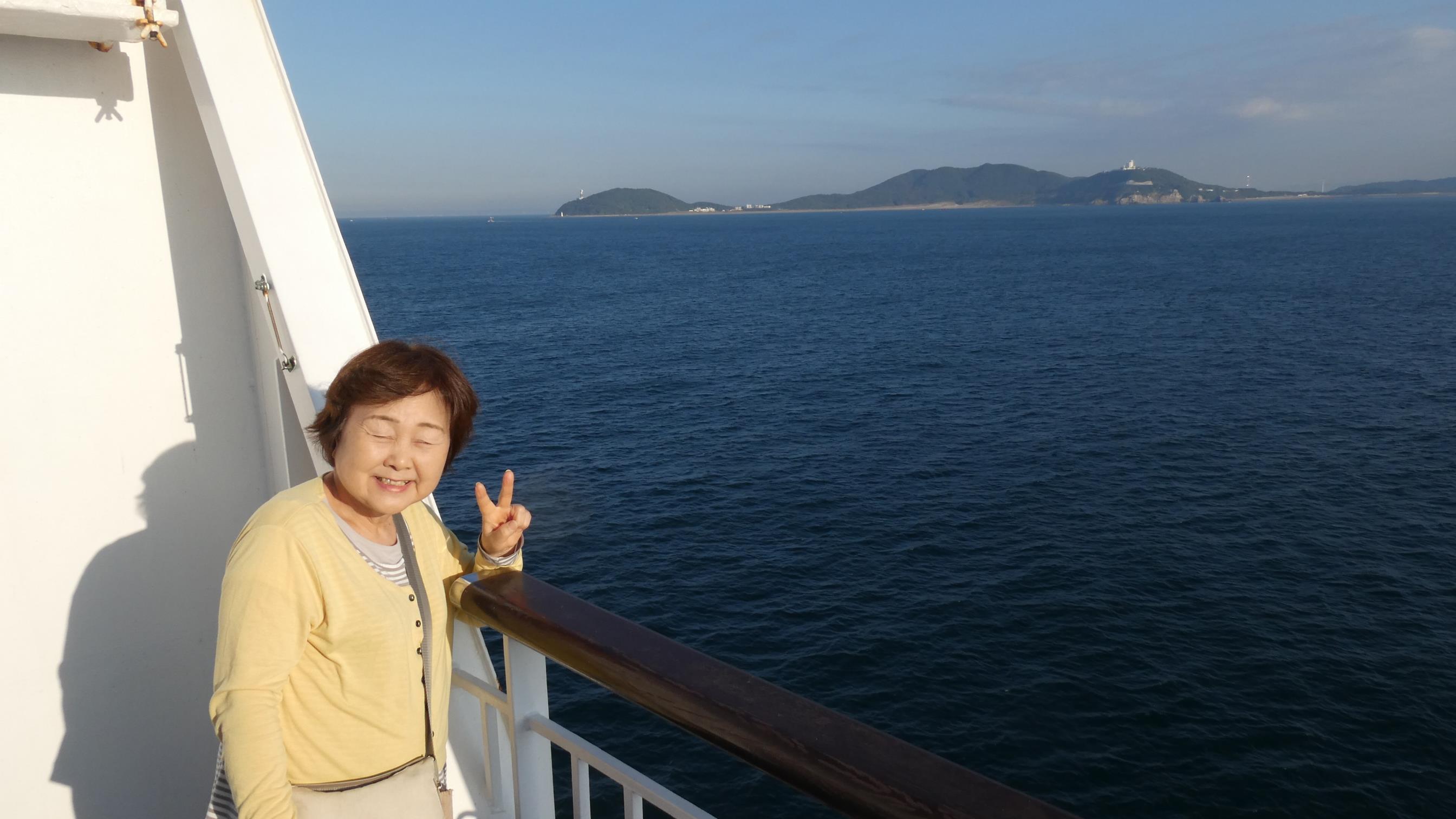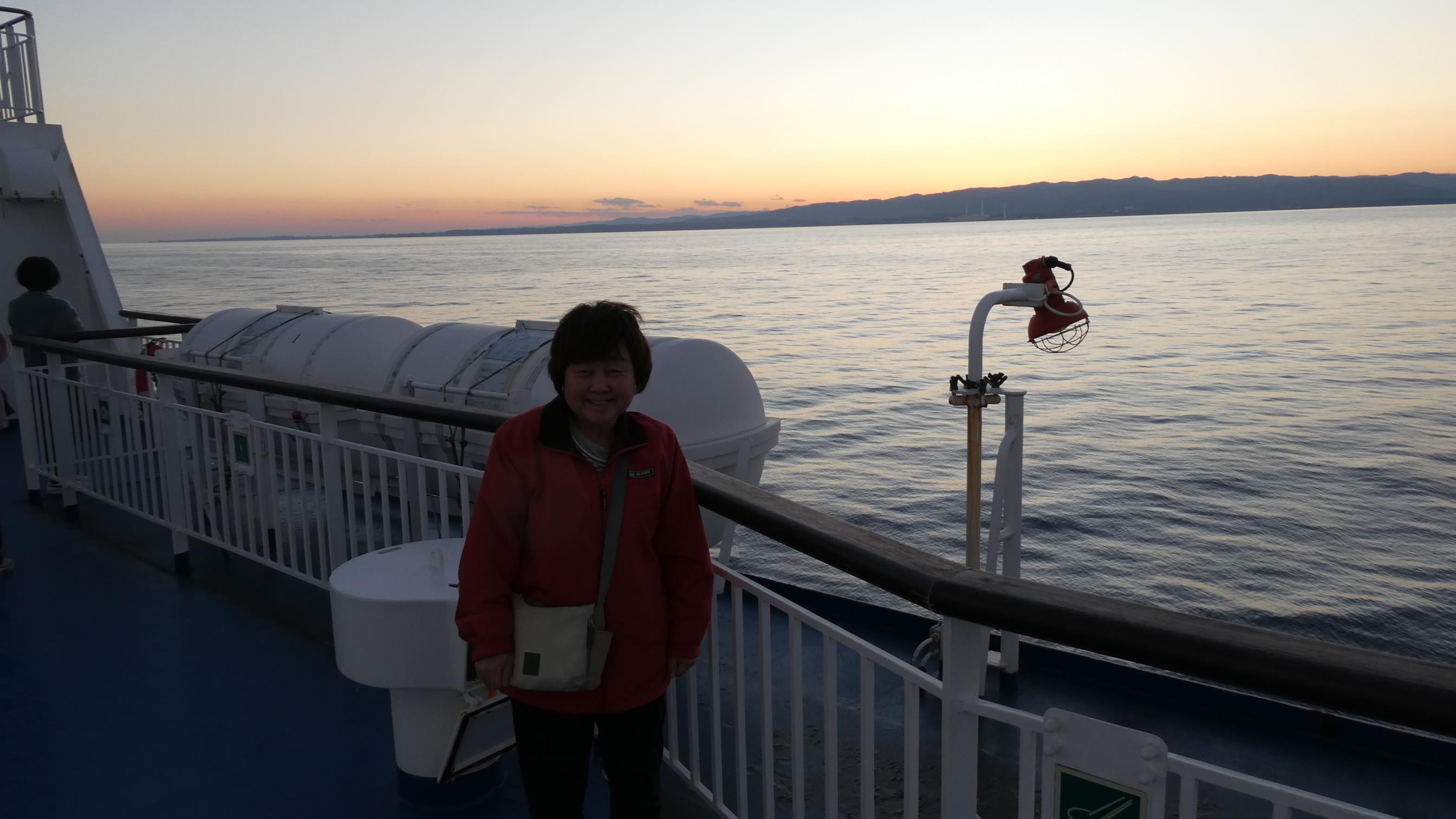 デッキに出て、伊良湖岬と写真撮る 船内アナウンスでは、ヤシの実で有名な伊良湖岬、と案内していた