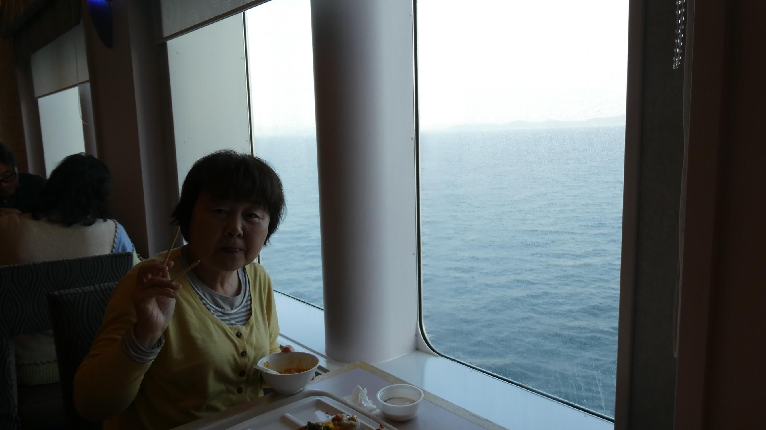 朝食時は渥美半島沖を航行中 窓ガラスが汚いのが難点だが、雄大な景色を見ながら朝食する