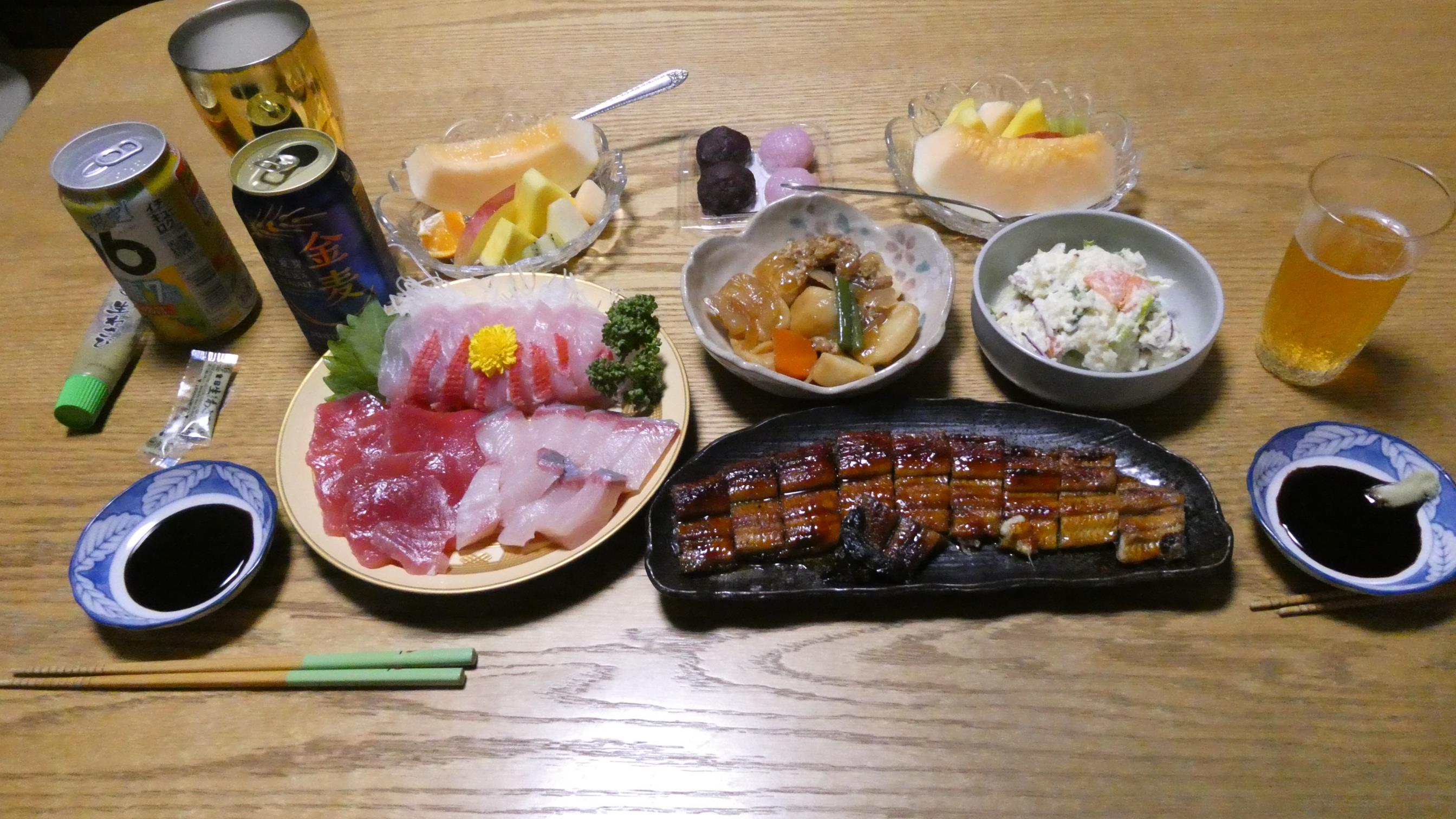 旅行打上のご馳走 国産のうなぎと、刺身はブリ・マグロ・キンメダイ、肉じゃがにポテト、デザ−トに果物と饅頭 我が家の精一杯の贅沢