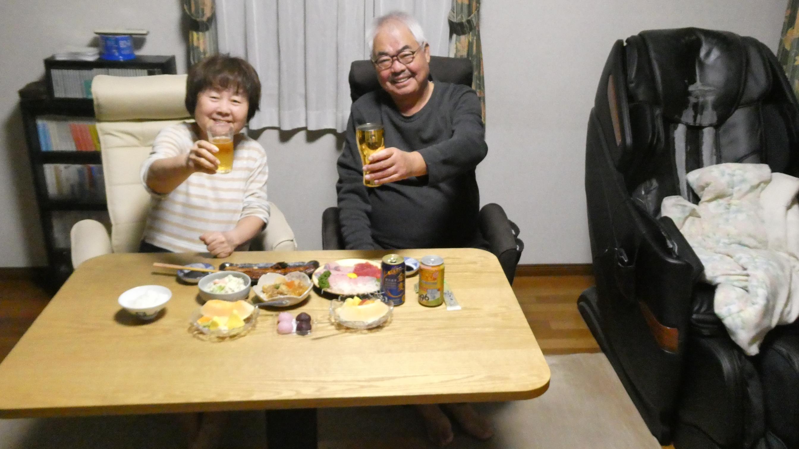 夕食の乾杯 缶ビ−ルと持参した焼酎で、アルコ−ル代も安く済む