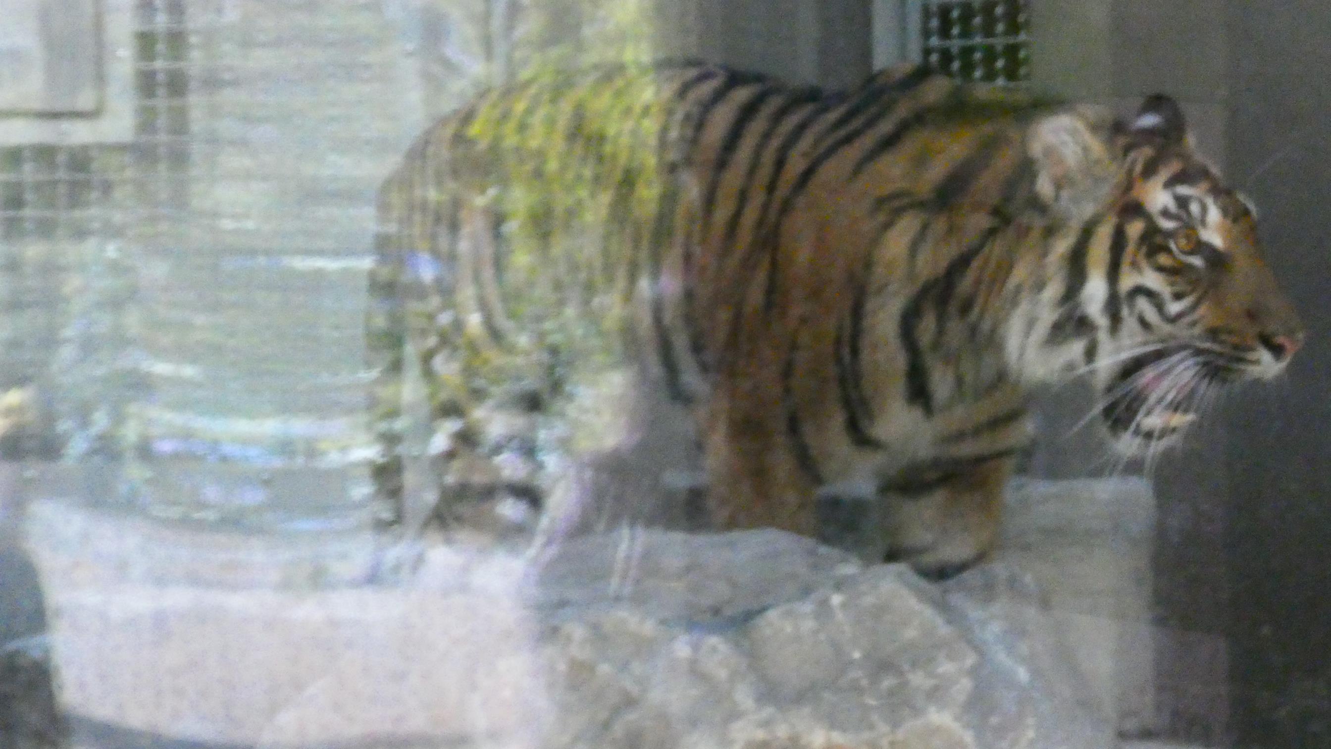 スマトラトラ 狭いガラス張りの部屋を行ったり来たり ガラスが反射してキレイに撮れず