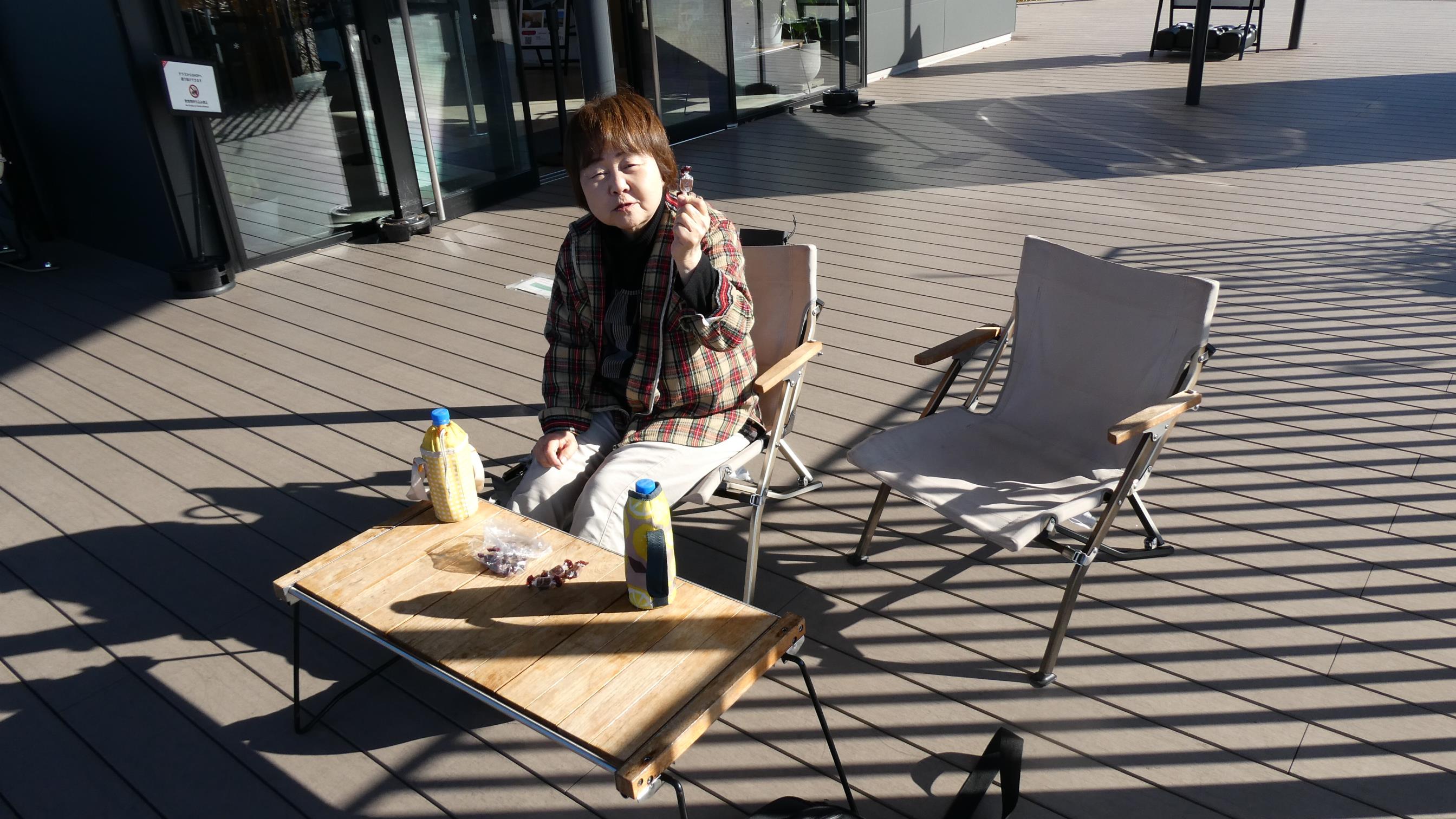 展望台にベンチが無い 喫茶店が営業前だったので、喫茶店のベンチで小休止 持って来たチョコレ−トを食べる