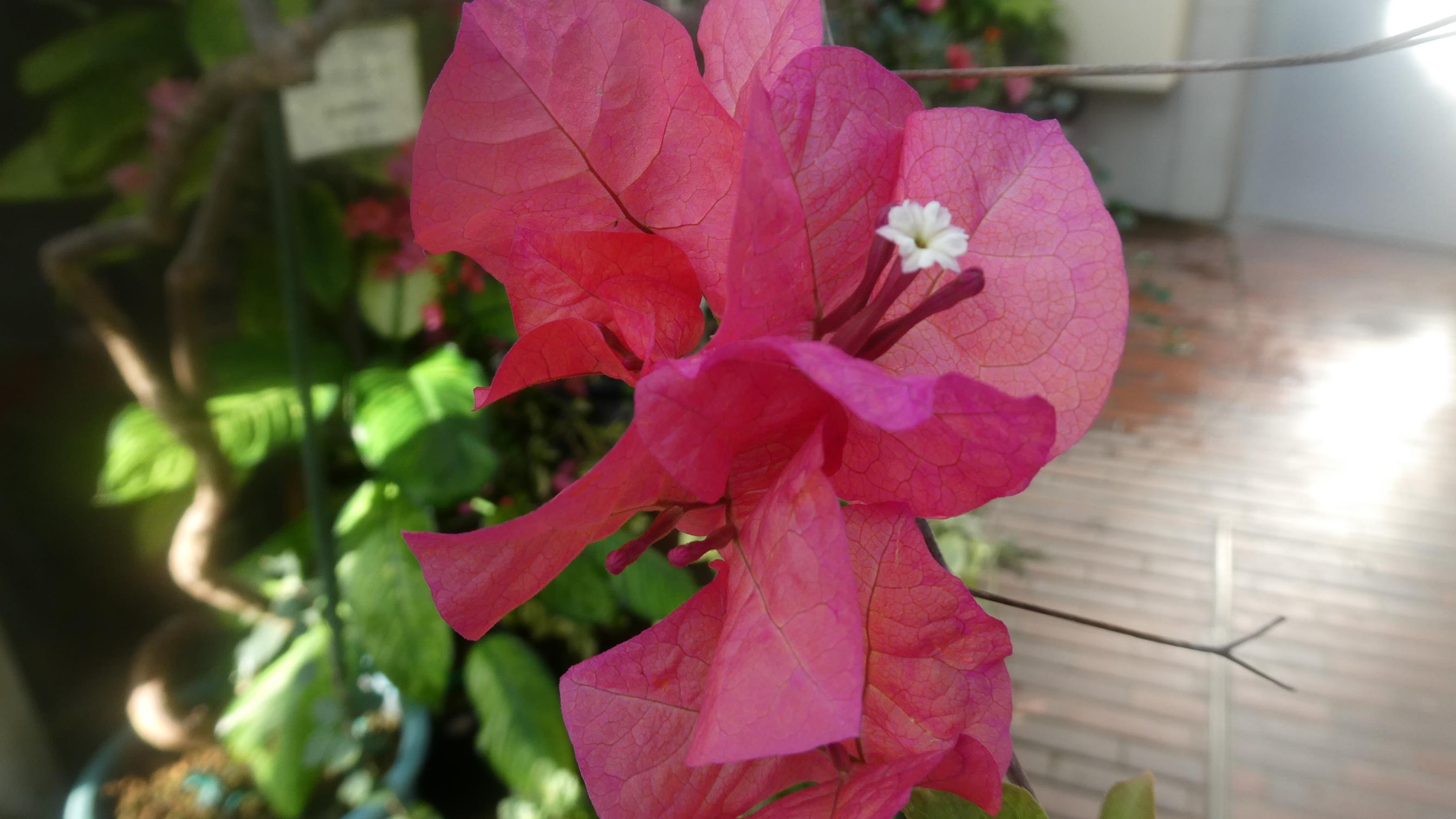 ブ−ゲンビレア ピンクの花びらの中に、小さな白い花が咲いている