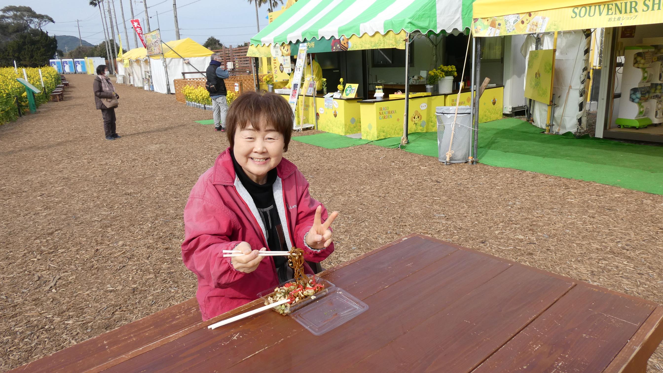 昼食前に焼きそばで一息入れる 菜の花料理とあるが、焼きそばには菜の花は入っていない