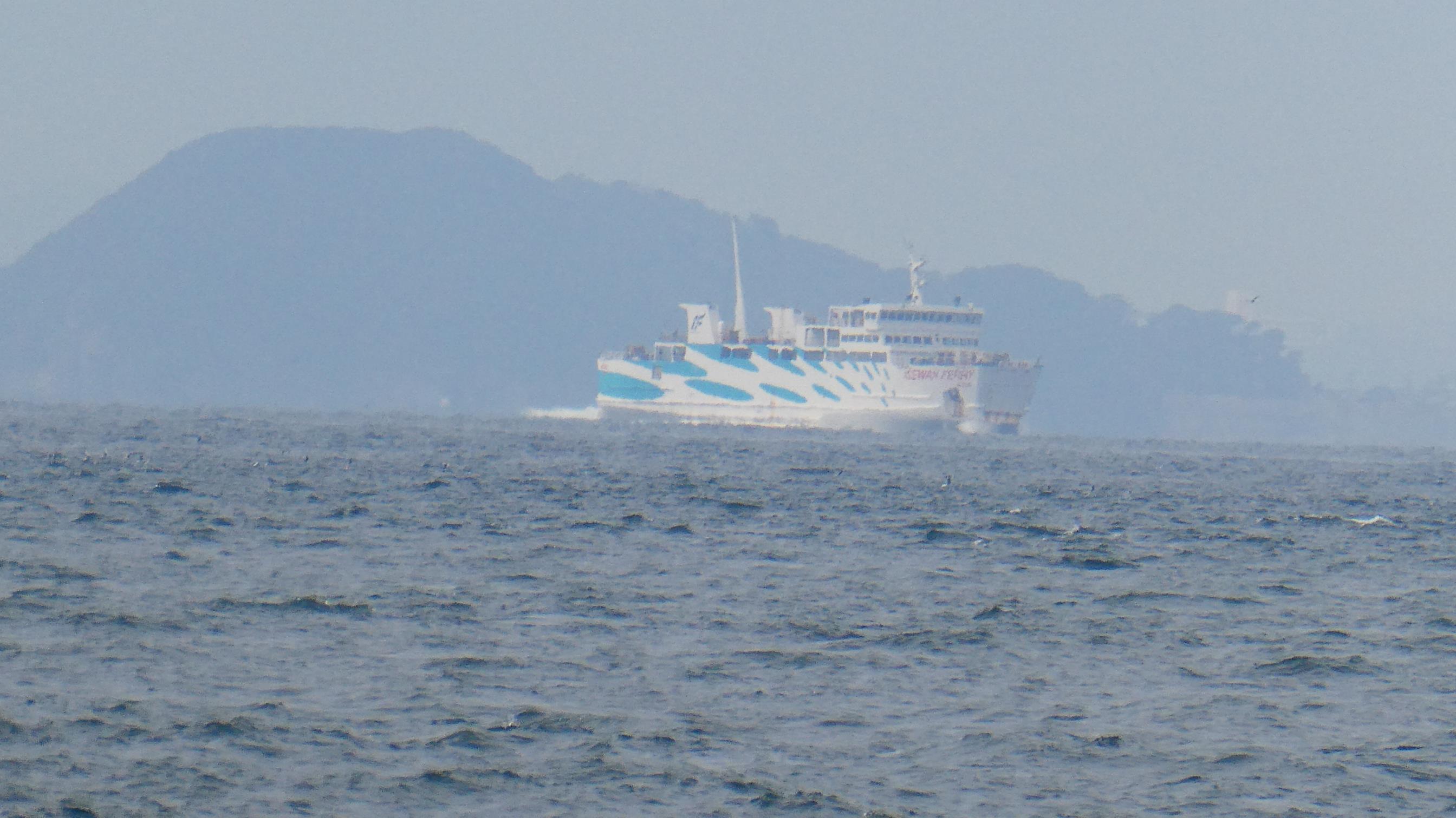 ルミックス-TZ99の30倍ズームは素晴らしい 小さな点が、はっきりフェリ−と分かる 伊勢湾フェリ−は、国道42号線になっているのが面白い