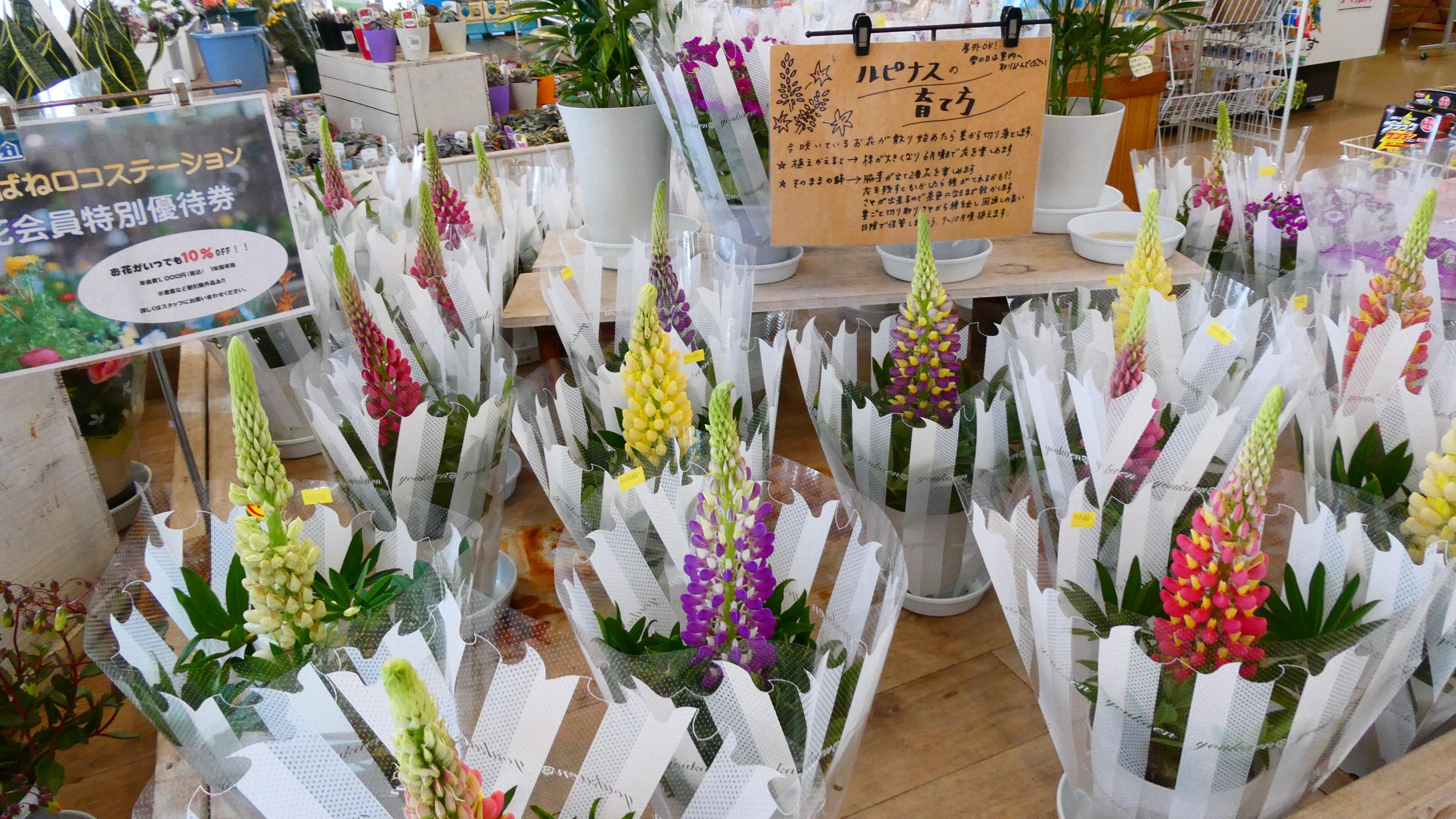 道の駅の売店 花もいっぱい売っている ルピナスとあるこの花、清廉な感じで何ともキレイ