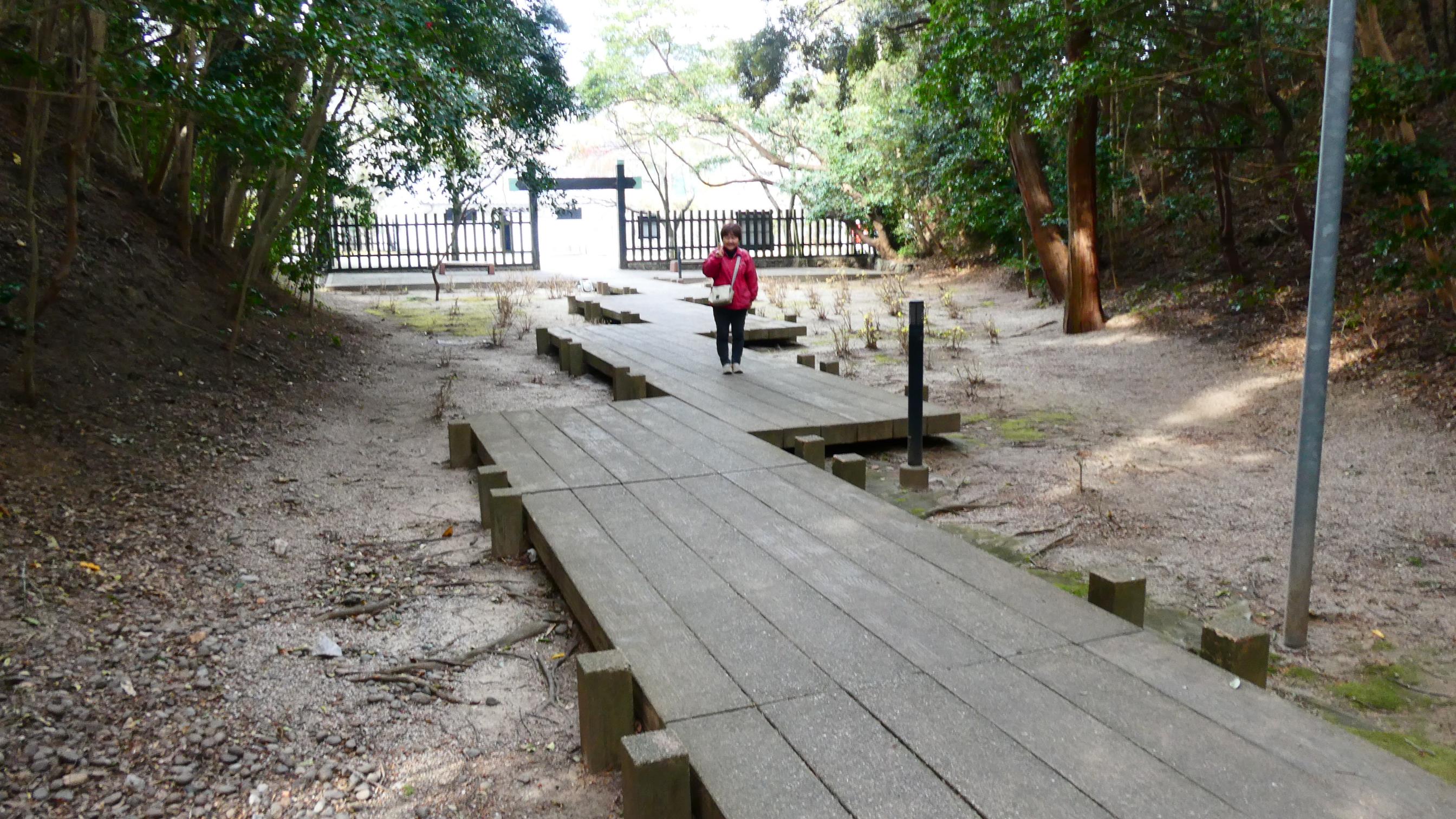 灯台へ行く遊歩道は砂をかぶっている 骨折で車椅子生活の4年前、ここを車椅子で通ろうとしたら、砂にうまり動けなくなり、通行人に車椅子ごと持ち上げて、助けてもらったのを思い出す