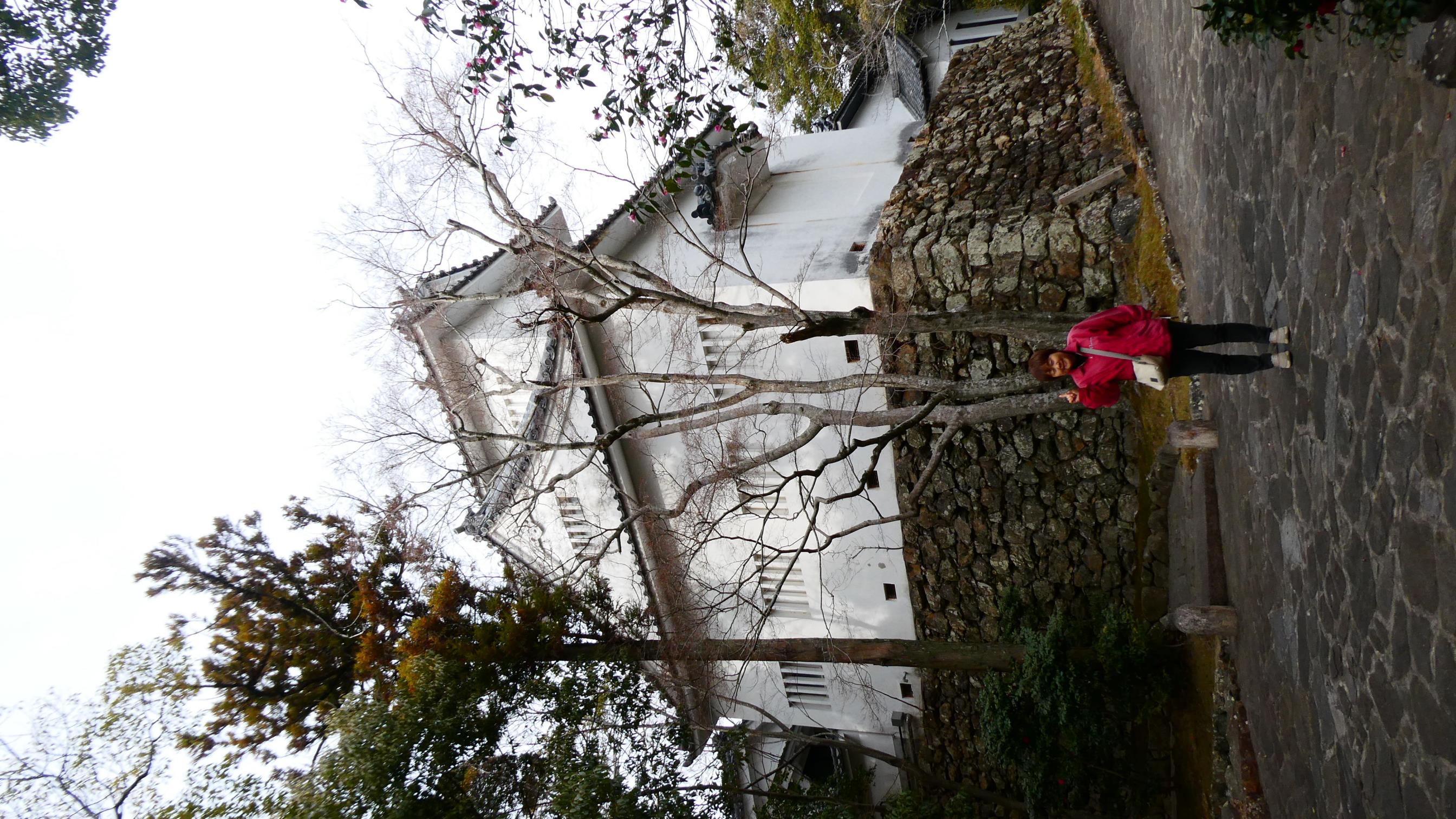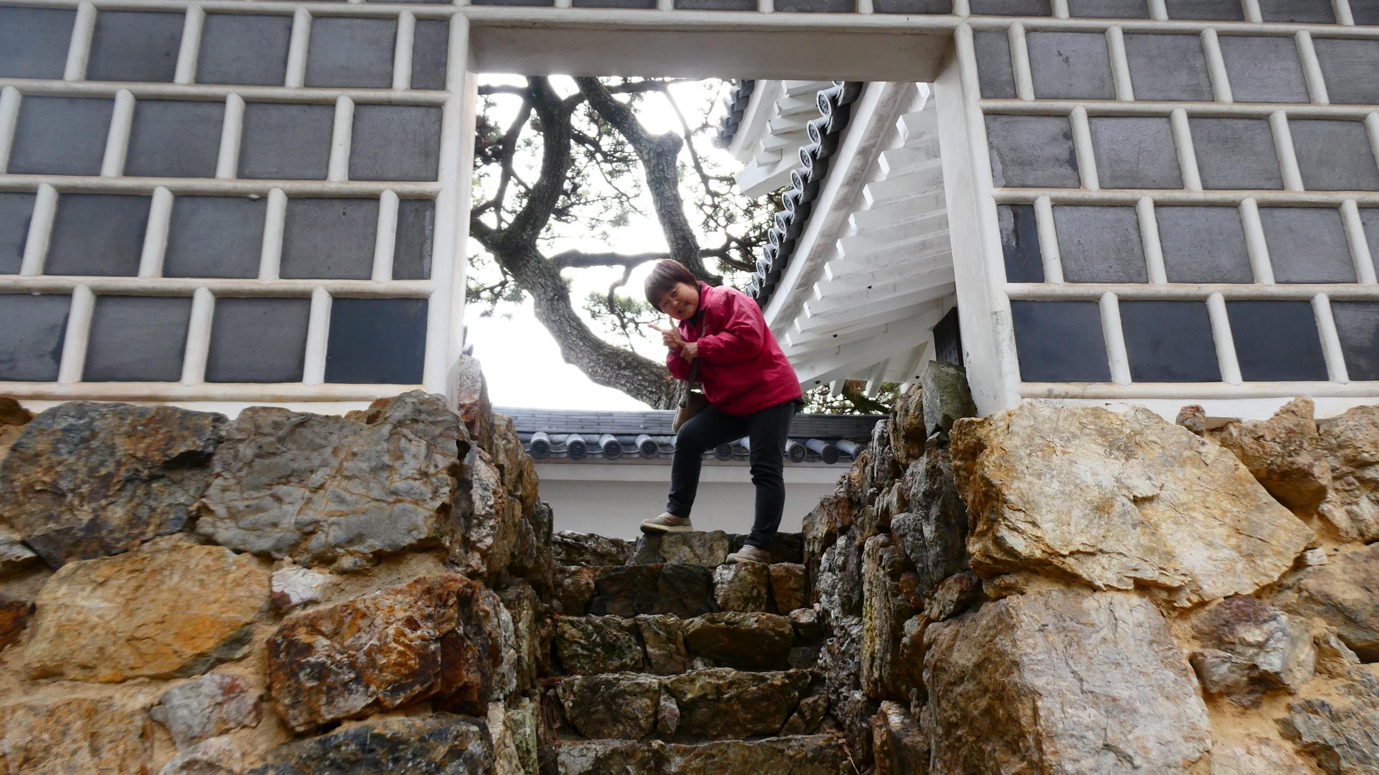 桜門の石垣に上がれる 写真では見えないが、桜門の壁は鉄砲の狭間(穴)がいっぱい