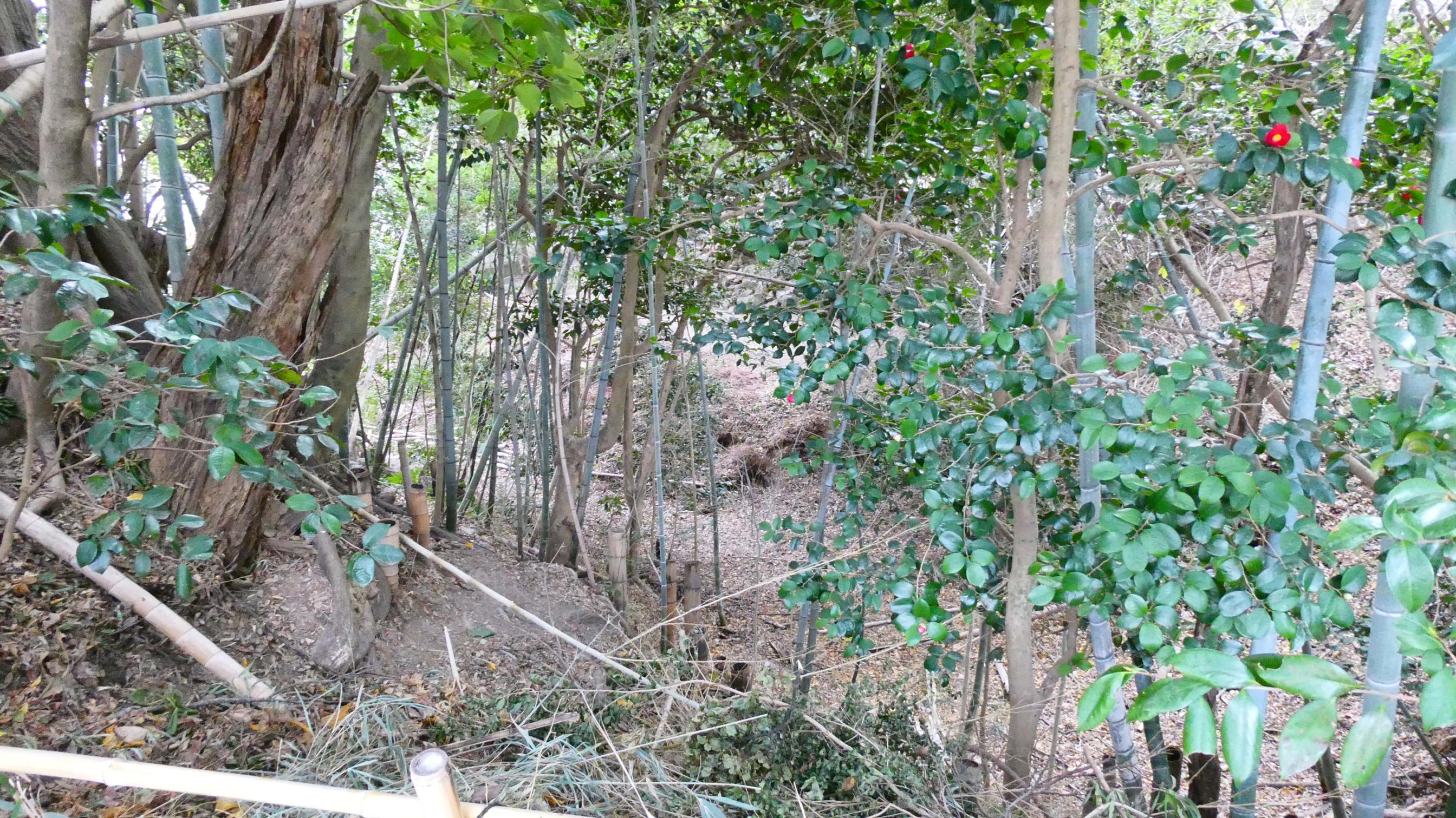 本丸と三の丸の間の空堀 藪になっていてよく見えないが、とても深いのが分かる