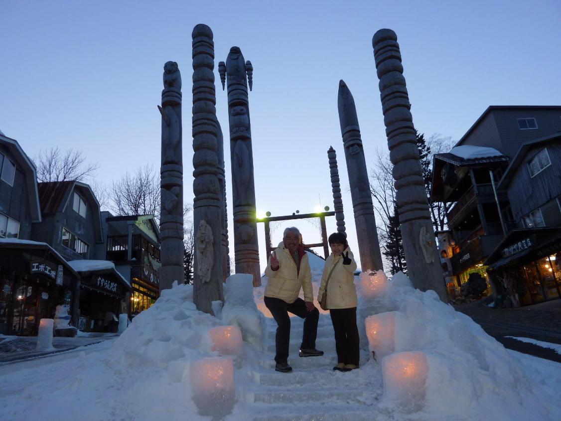 今日は夜遊びが続く 夕食前に来たアイヌコタンで、アイヌの古式舞踊を見学(当然有料)