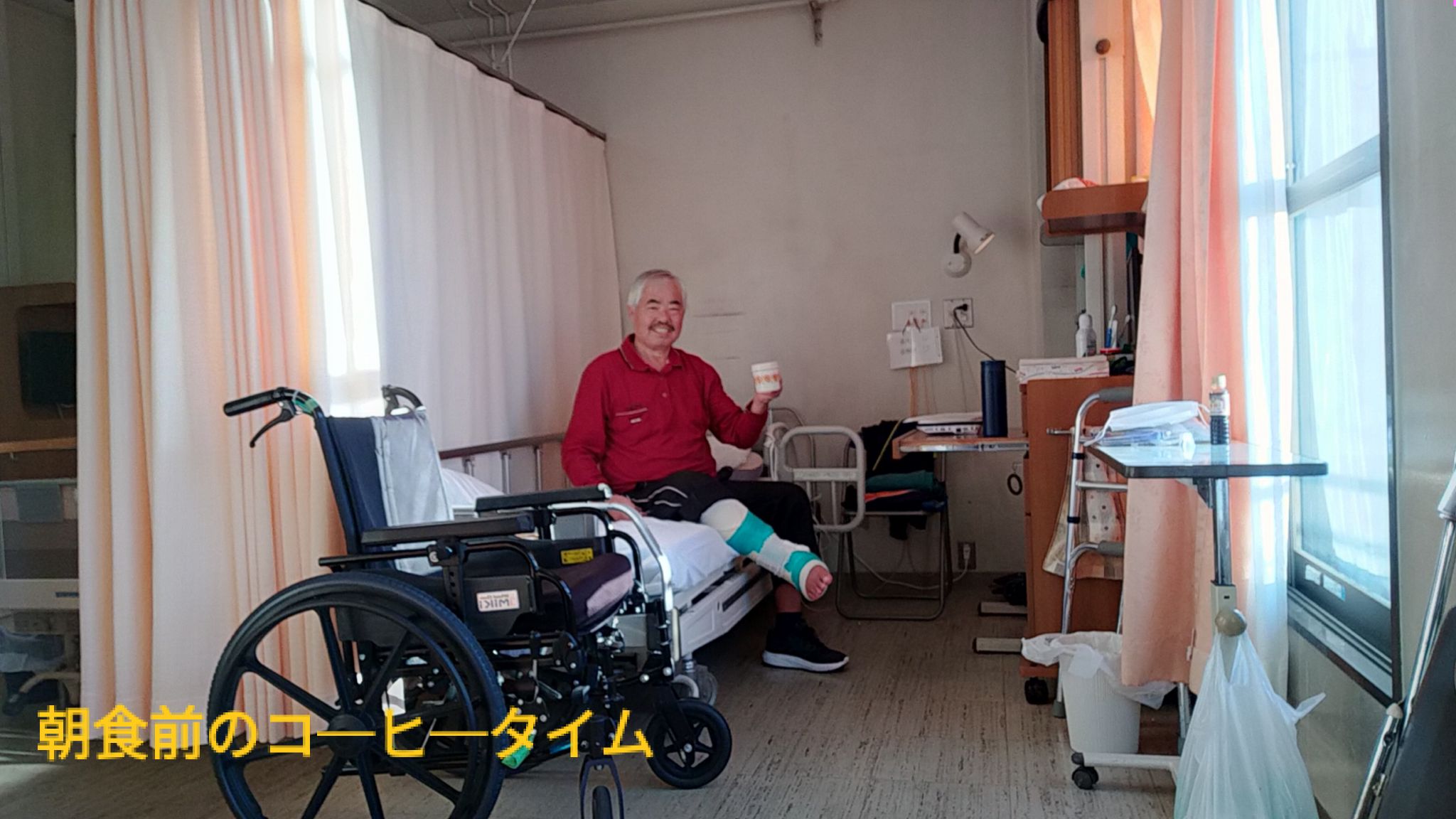 ◆手術の翌日には、導尿やオムツも取れて、左脚はギブスでちょっと動かし難くなるが、車椅子の移動は問題なく、今までと同じ入院生活に戻る