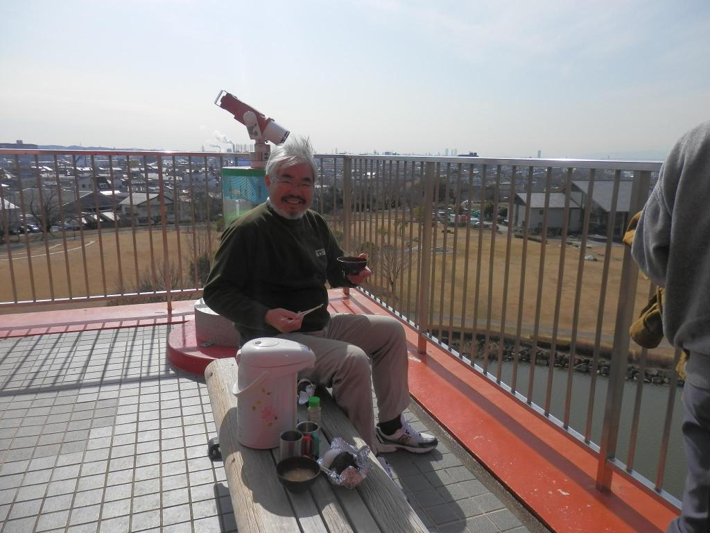 塔の7階が展望台 持込んだお握りとトン汁の昼食