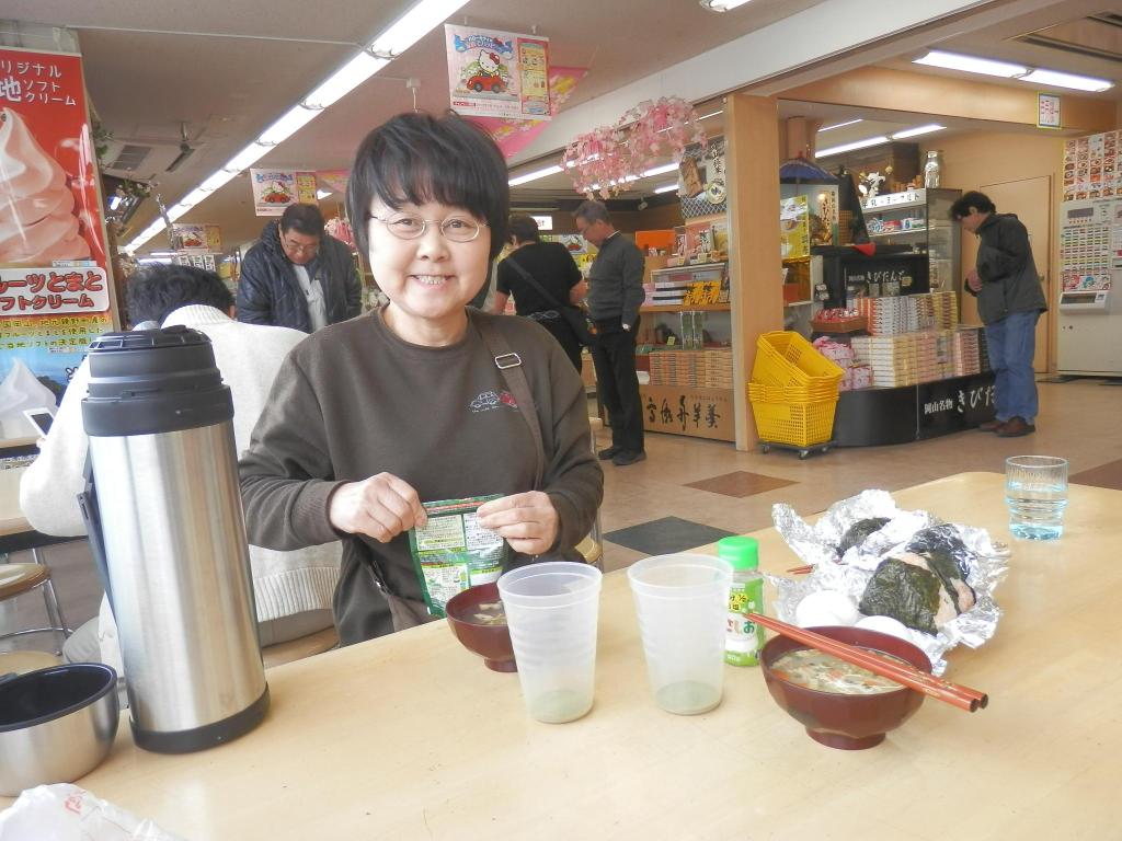 勝央SAで昼食 何時もの豚汁とゆで卵とお握り