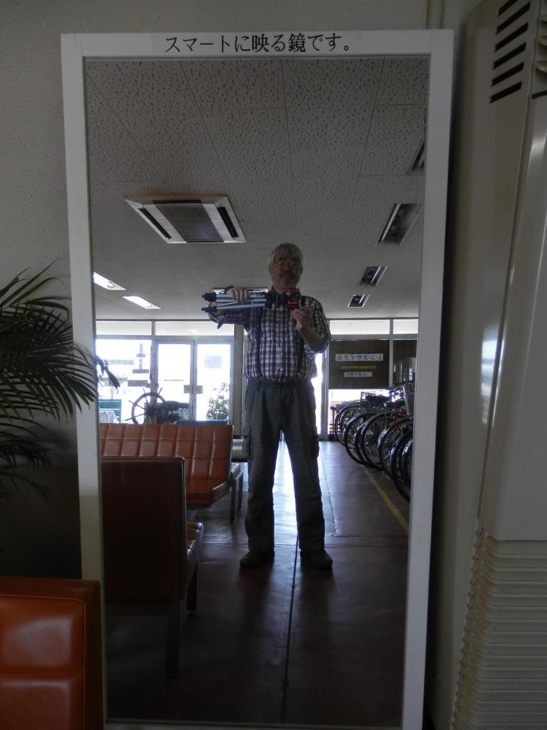 本島港の待合室にこんな鏡があり ちょっとはスマートに見える