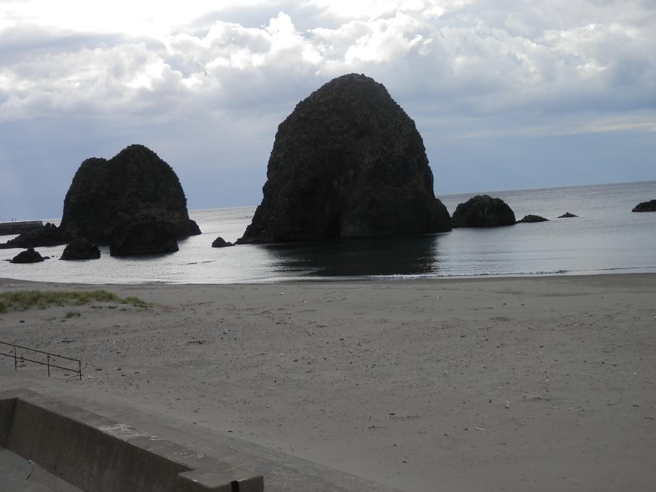 奇岩立ち並ぶ海岸だが、浜は砂浜で広くてキレイ