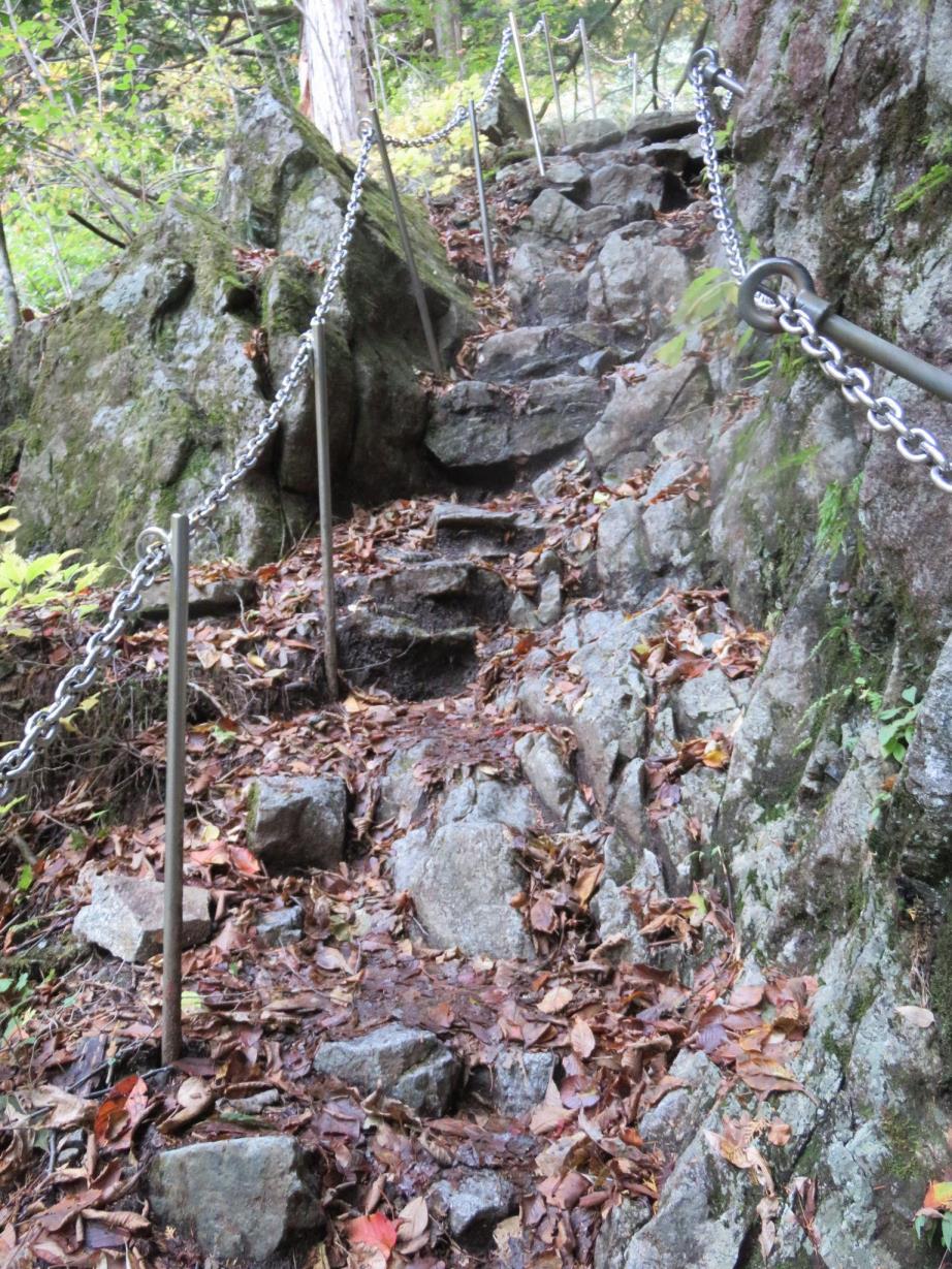 岩登りの道も随所にあり、鎖にしがみつきながらの歩が続く