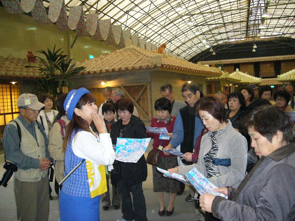 沖縄最初の観光は琉球村 ガイドさんの説明を聞く