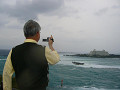 強風の中シーサーとホテルを撮る