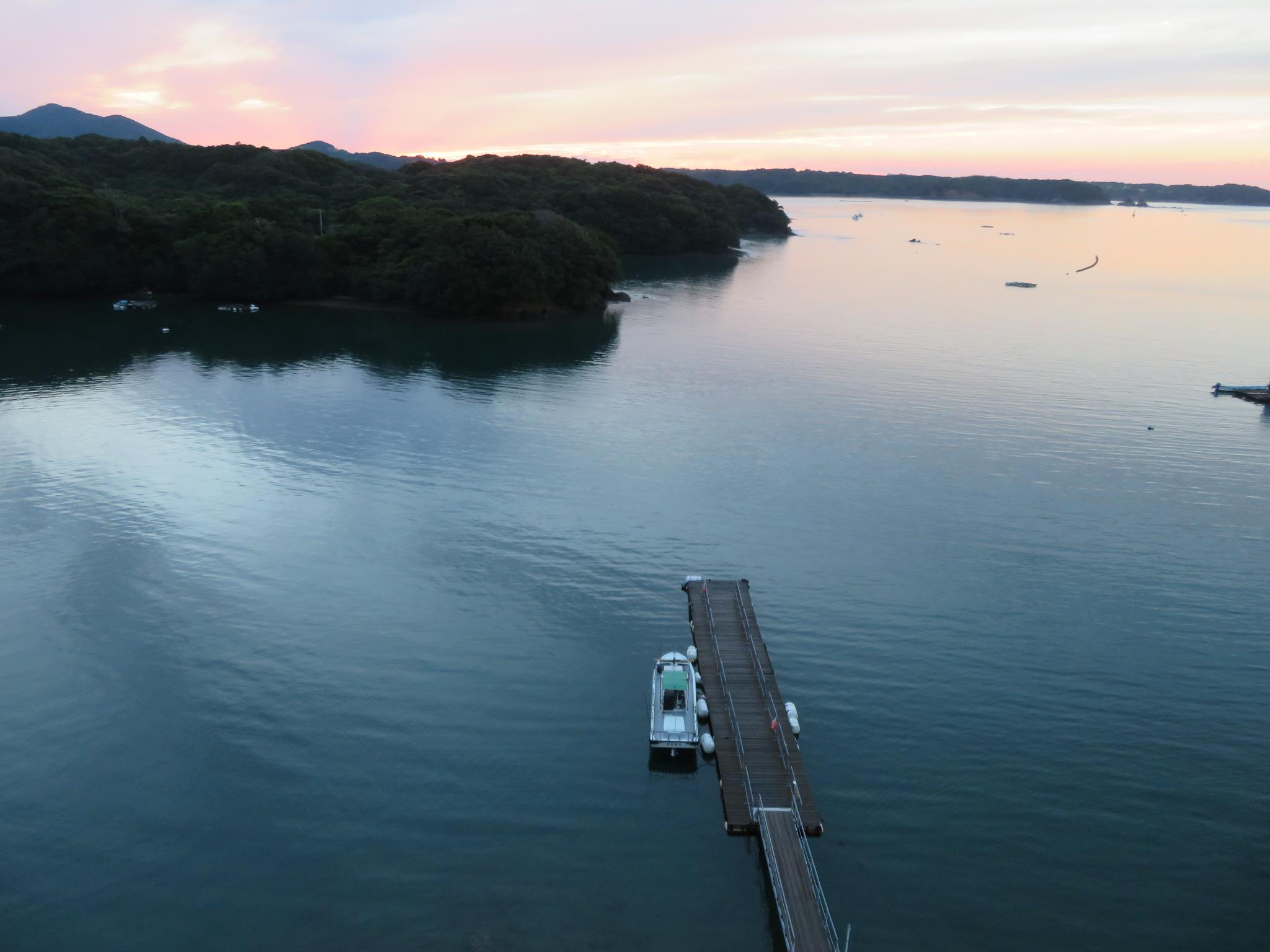 朝食後、ホテルの釣り船の桟橋に降りて、英虞湾を見る