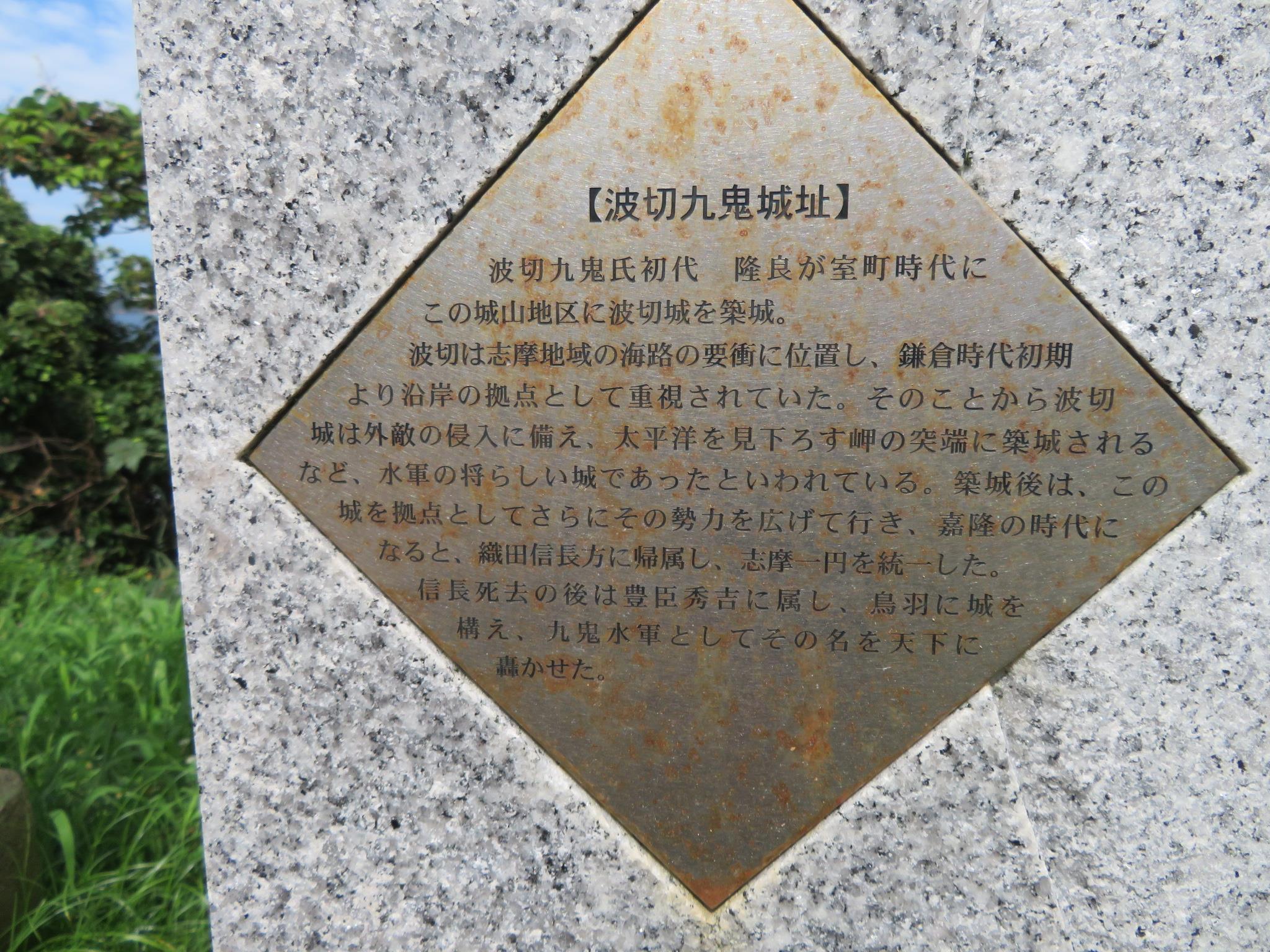 八幡さん公園の入口に、波切九鬼城址の碑がある 九鬼水軍の拠点の城で、信長や秀吉に仕えたと書かれている
