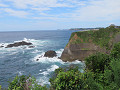駐車場は有料の所しかない 駐車場から海岸に出ると、宝門の浜の標柱があり、荒々しい海岸が見える