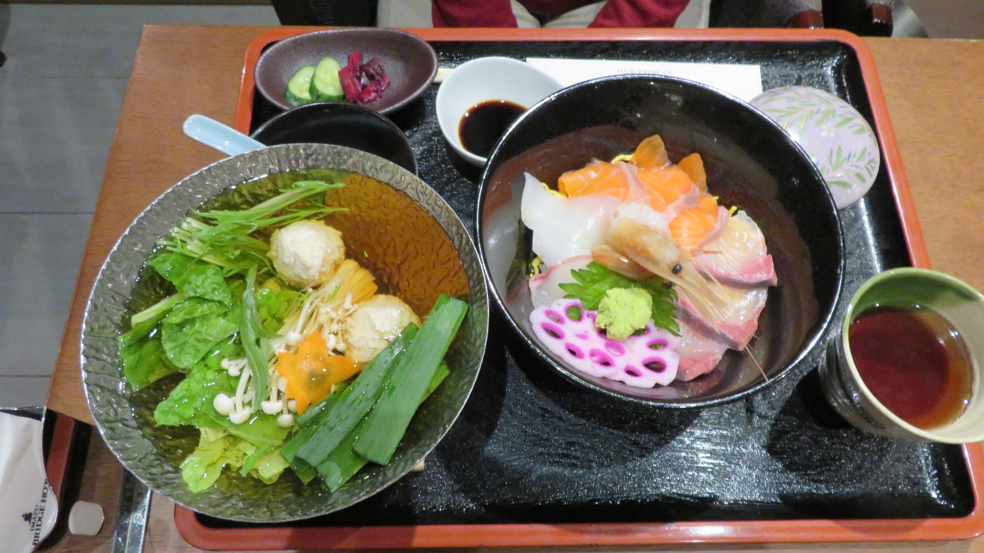 女房が選んだ海鮮丼膳も中々美味そう ちょっとした鍋が付いているのが良い