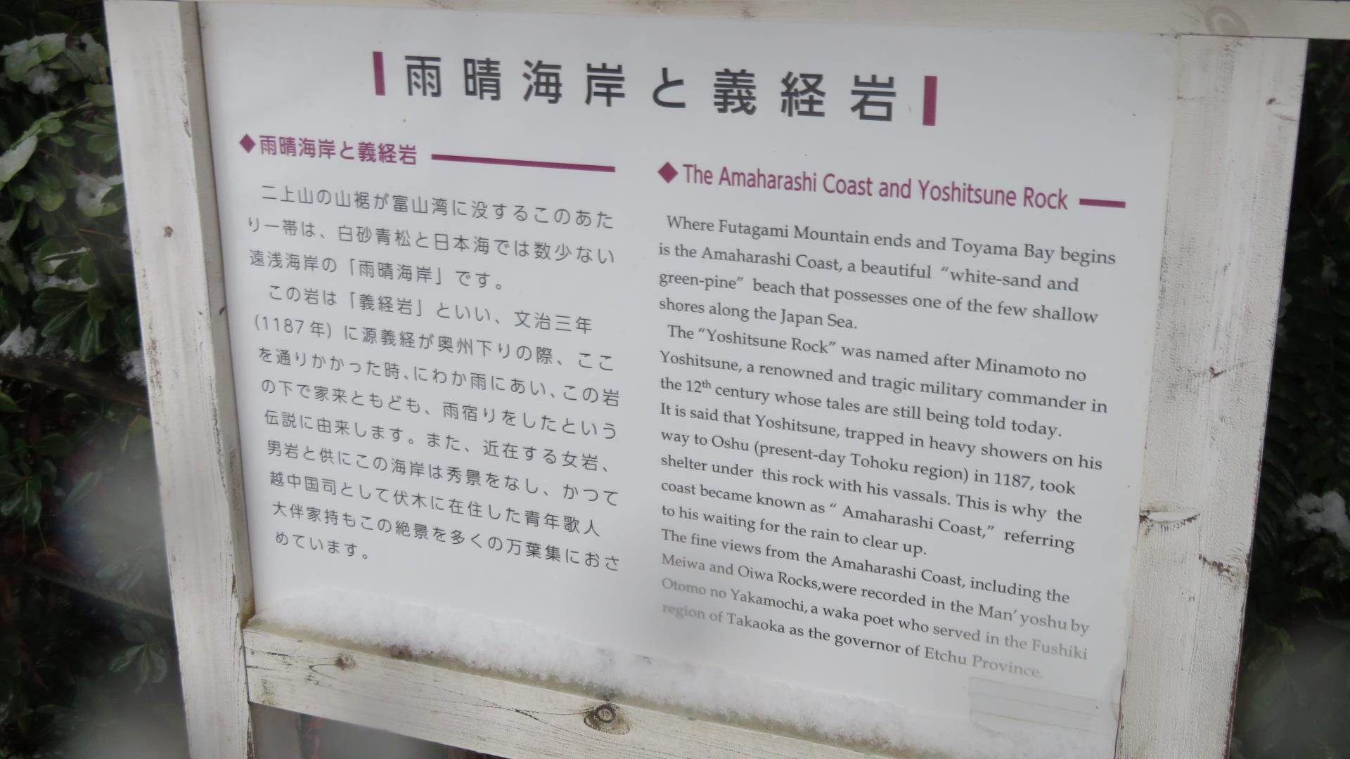 この岩は義経岩 義経が奥州へ下る時、ここで雨宿りすると、雨が上がったと言う伝説があり、雨晴海岸の名が付いたそうだ