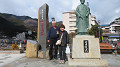 下呂市観光交流センター前に碑と坊さん銅像がある