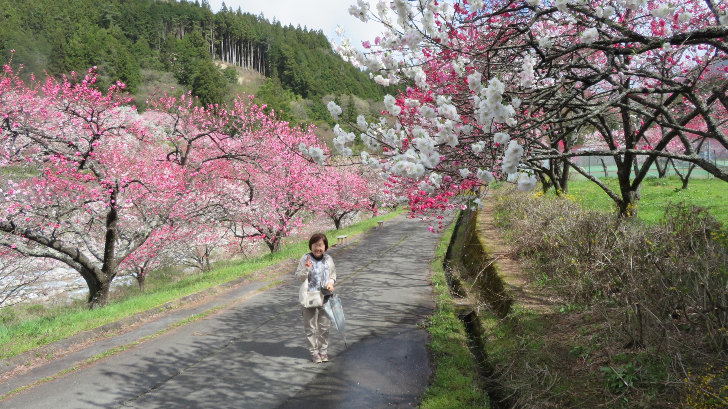 前のパンフレットの左下の黒丸を付けた所に駐車すると、左上にある写真・川岸にびっしり咲く花桃の並木道、に一番近い