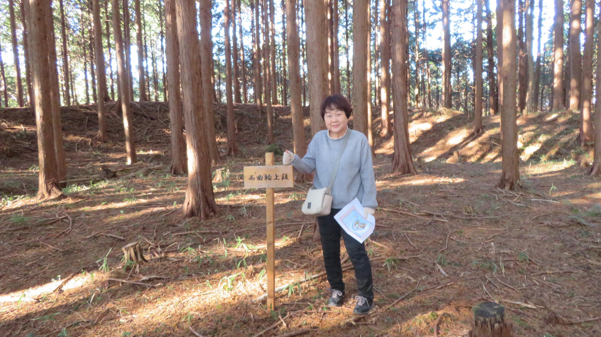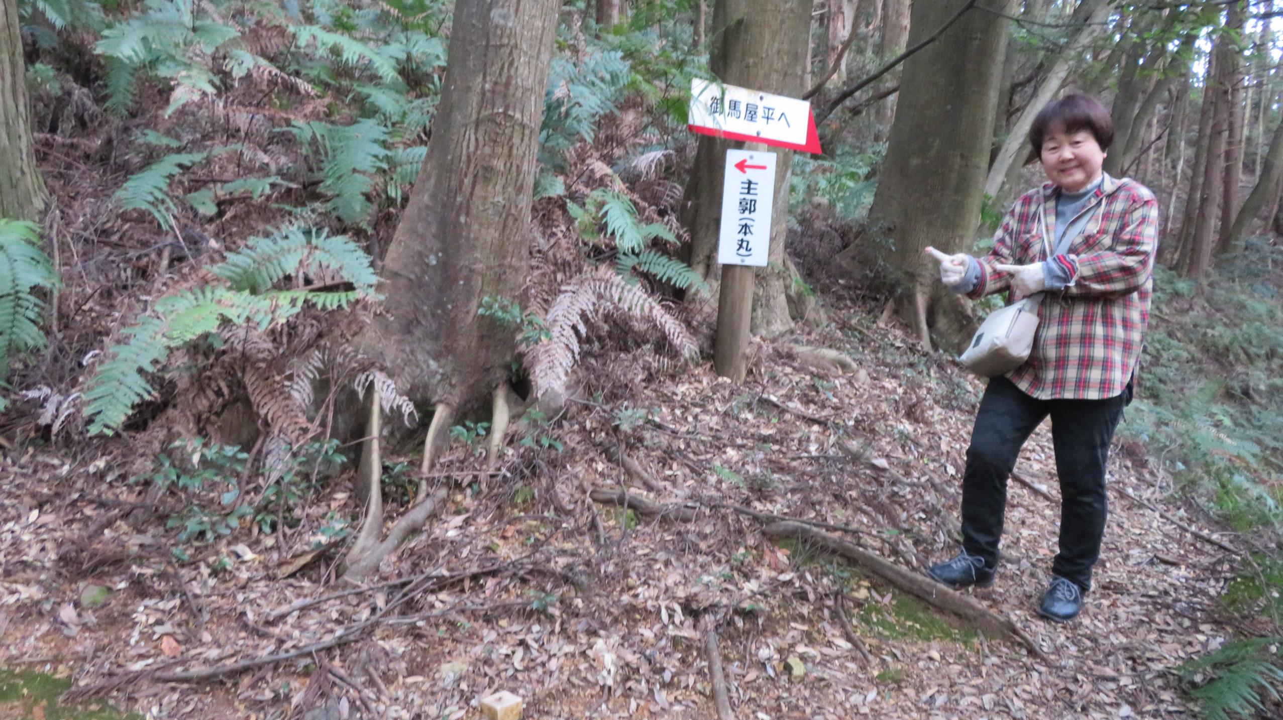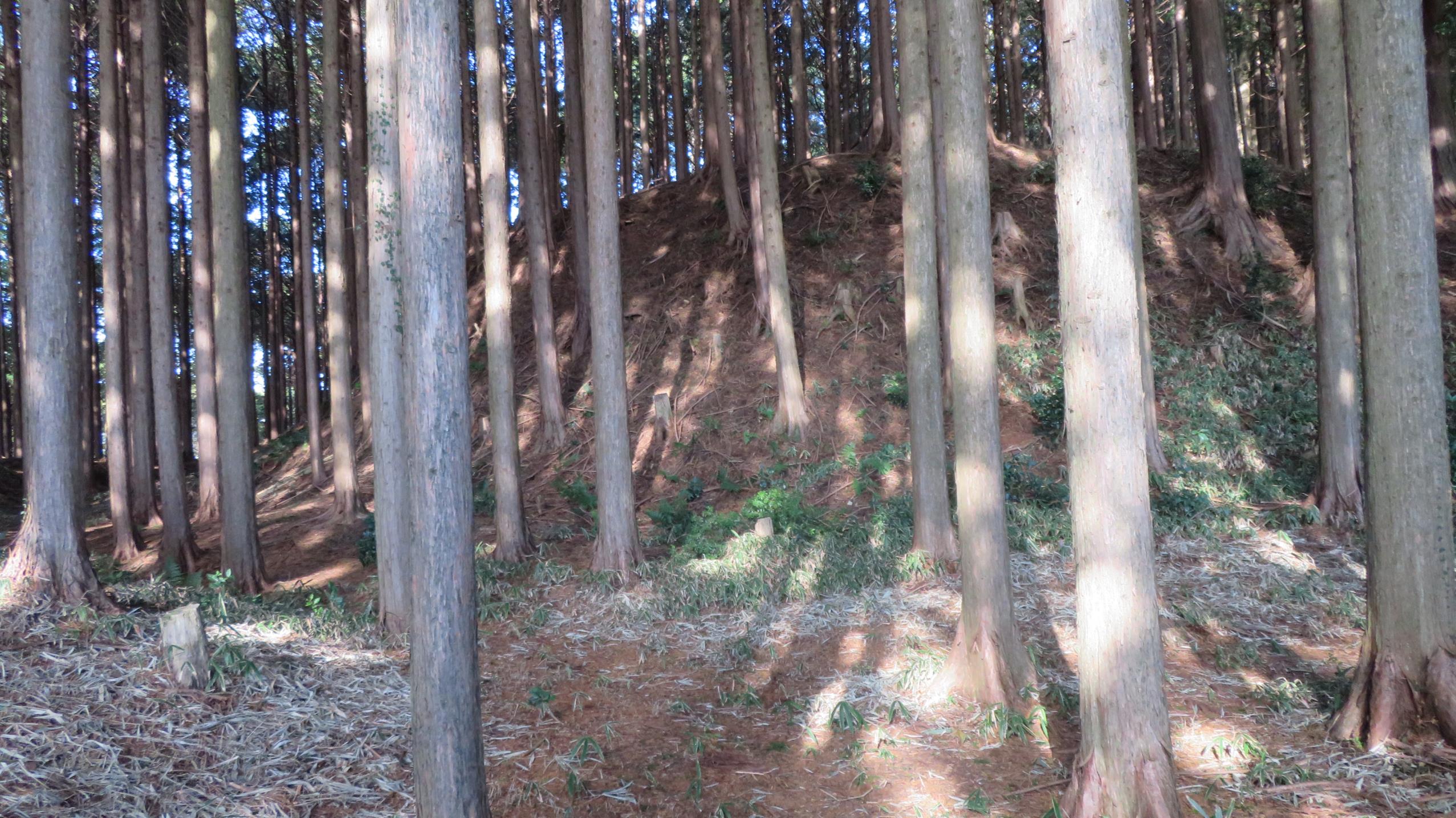 本丸から納所平への道はロープで通行止め 杉の木がキレイに手入れされている