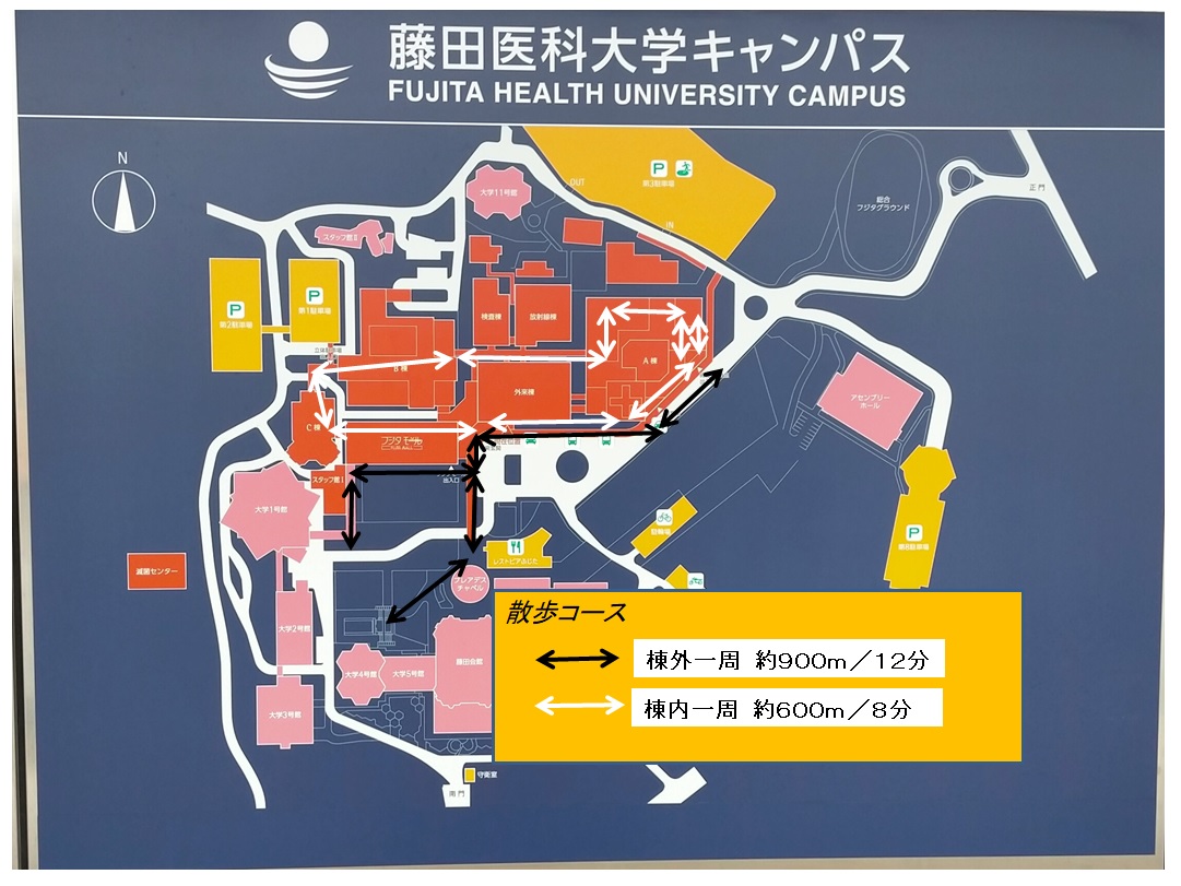 病棟外3周と病棟内1周歩くと、45分程かかり7000歩以上になる