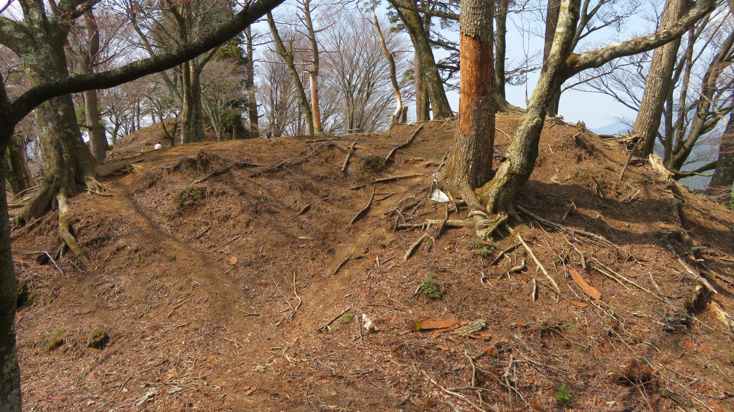米蔵跡から本丸跡を見る 土塁と堀切の景色が良い