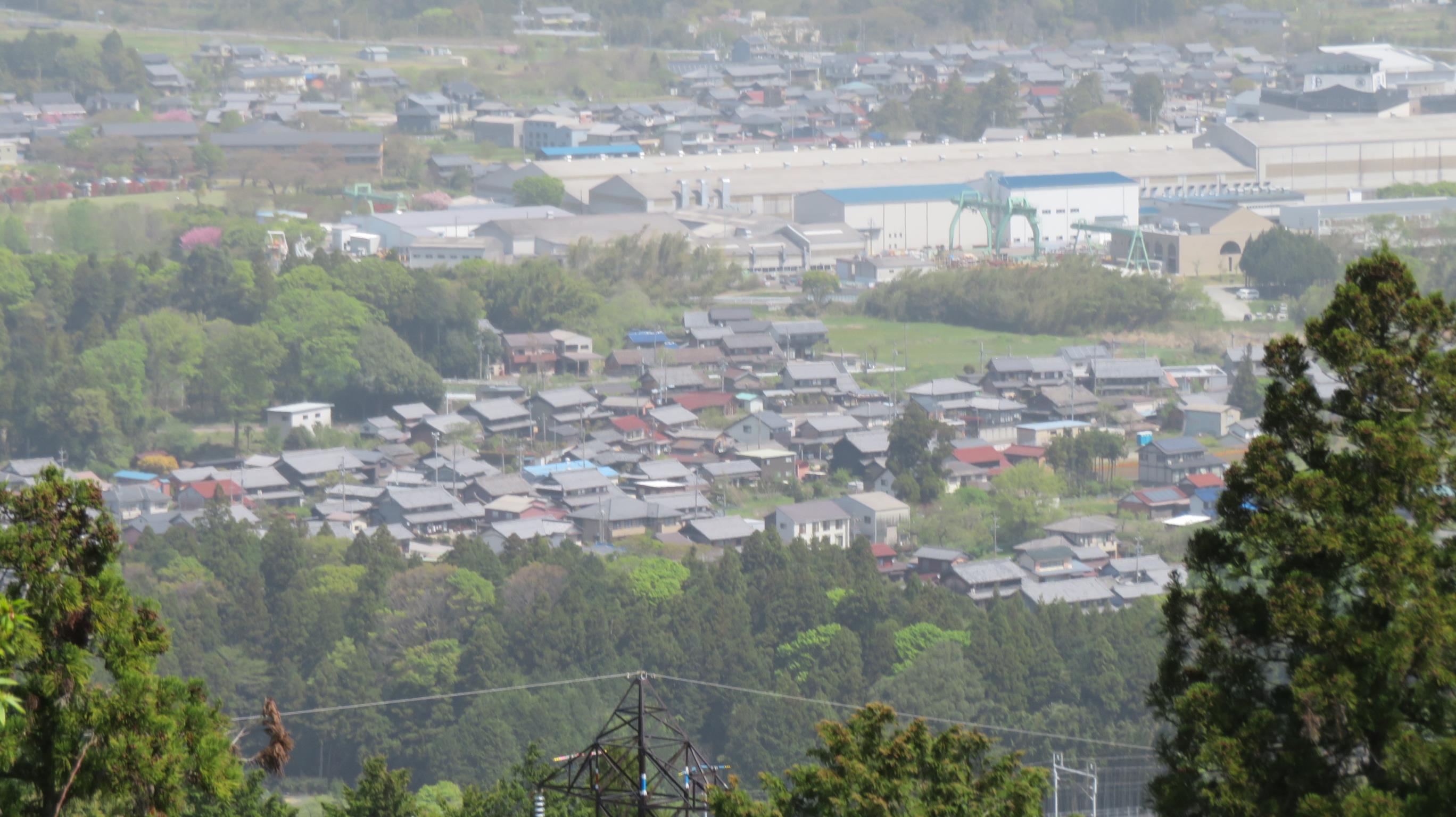 左上の低い方の山が松尾山 右の緑の山が天萬山で、宇喜田秀家と大谷吉継の陣跡