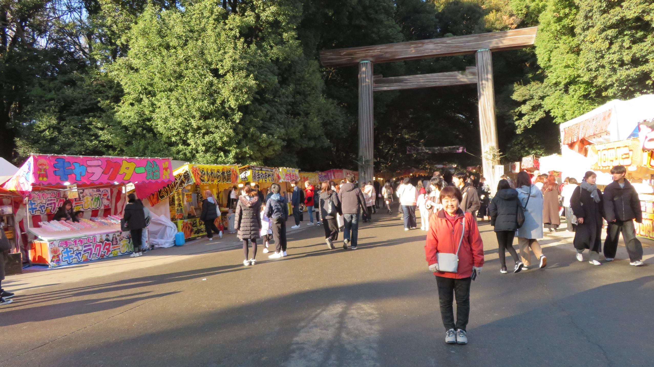 大きな木の鳥居がある まだ正月3日で大勢の初詣者がいる