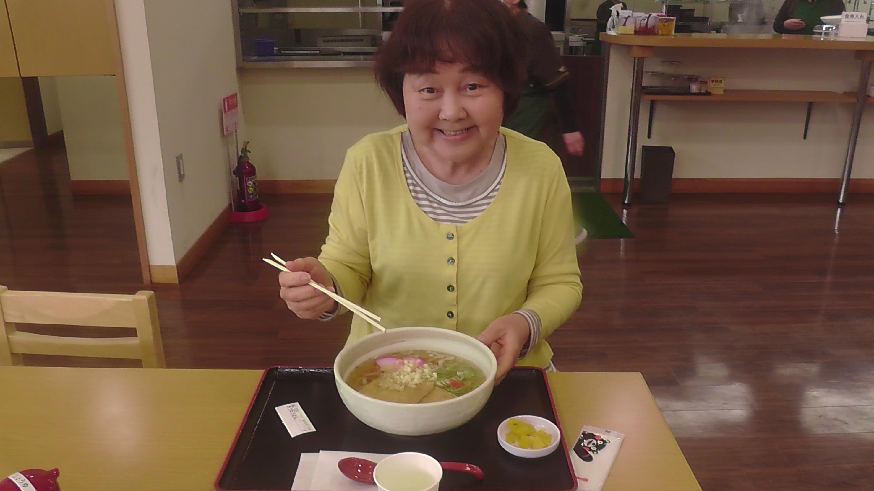 女房はきつねうどん 今日は人吉温泉の旅館泊で、会席料理のご馳走が出るので、昼は少食で済ます
